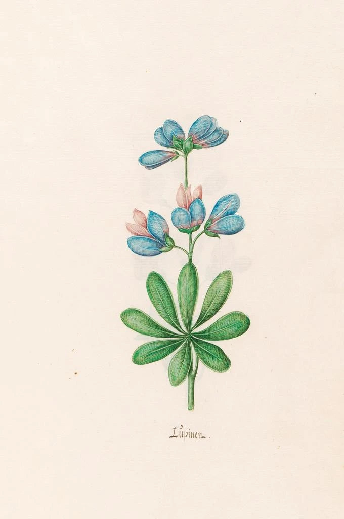 Magdalena Rosina Funck, verksam under 1800-talet, är en framstående figur inom blomstermåleri. Hennes arbete utgör en del av en period då naturalistisk konst växte i popularitet, och hon lyckades särskilja sig genom sin förmåga att fånga blommornas skönhet med stor noggrannhet. Påverkad av tidens konstströmmar, lyckades Funck kombinera vetenskaplig observation med konstnärlig känslighet, och skapa verk som talar till själen. Hennes lupiner, i synnerhet, vittnar om hennes talang att för evigt bevara naturens flyktiga skönhet, samtidigt som de erbjuder en reflektion över livets cykel.