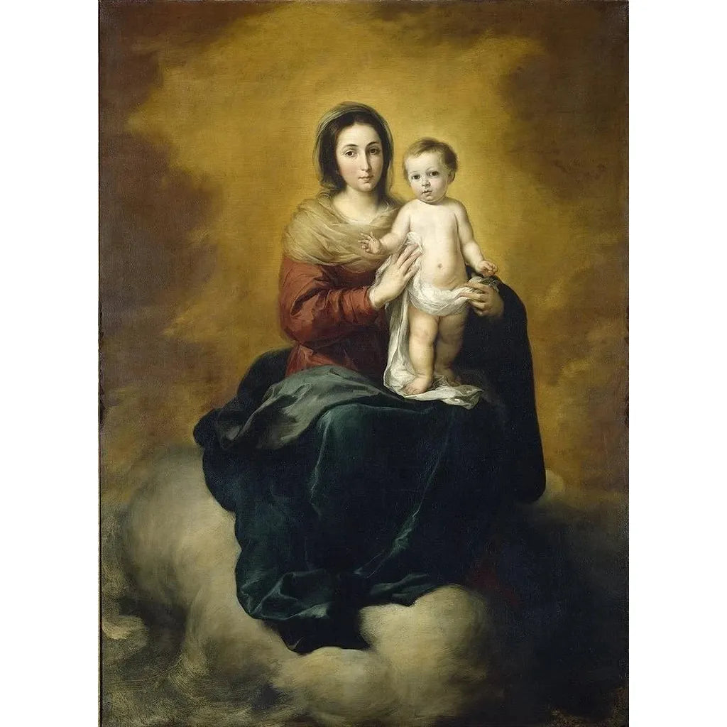 Murillos Madonnan med barnet är ett konsttryck som utstrålar mildhet och lugn. I denna komposition avbildas Jungfru Maria med sitt barn Jesus, inbäddade i ett mjukt ljus som förstärker deras andliga förbindelse. Pastellfärger och de fina detaljerna i ansiktena skapar en atmosfär av fred och skydd. Tekniken med olja på duk gör att Murillo kan leka med skuggor och ljus, vilket ger liv åt denna heliga scen. Detta konsttryck är en äkta inbjudan till att betrakta moderskärleken och tron.