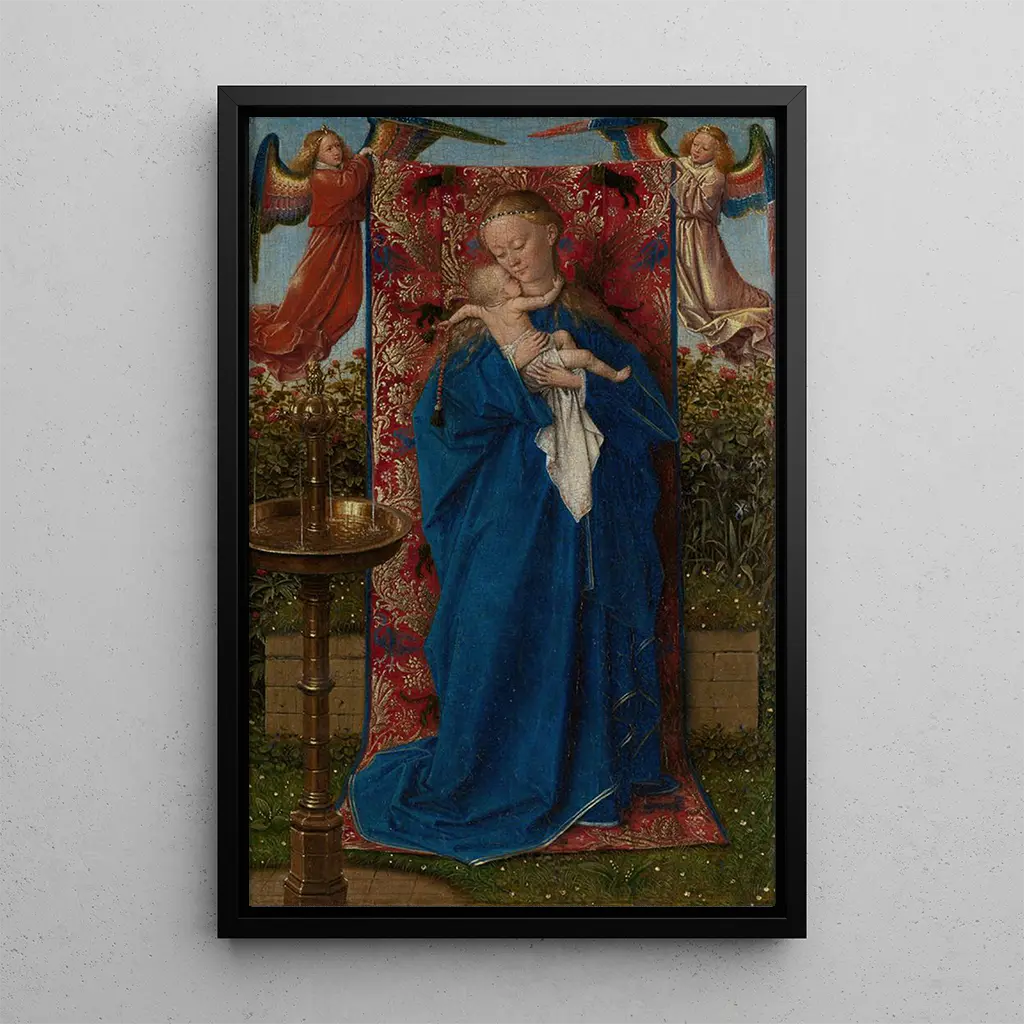 "Madonna vid fontänen" av Jan van Eyck är ett konsttryck som väcker känslor av mildhet och lugn i det gudomliga moderskapet. I denna delikata scen verkar Jungfru Maria, omgiven av frodig natur, erbjuda ett varmt skydd till Jesusbarnet. Pastellfärger och finare detaljer skapar en fridfull atmosfär, medan det mjuka ljuset framhäver de delikata dragen hos figurerna. Fontänen, en symbol för liv och rening, tillför en andlig dimension till denna framställning och inbjuder betraktaren till en djup reflektion över relationen mellan mor och barn.