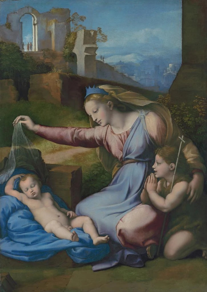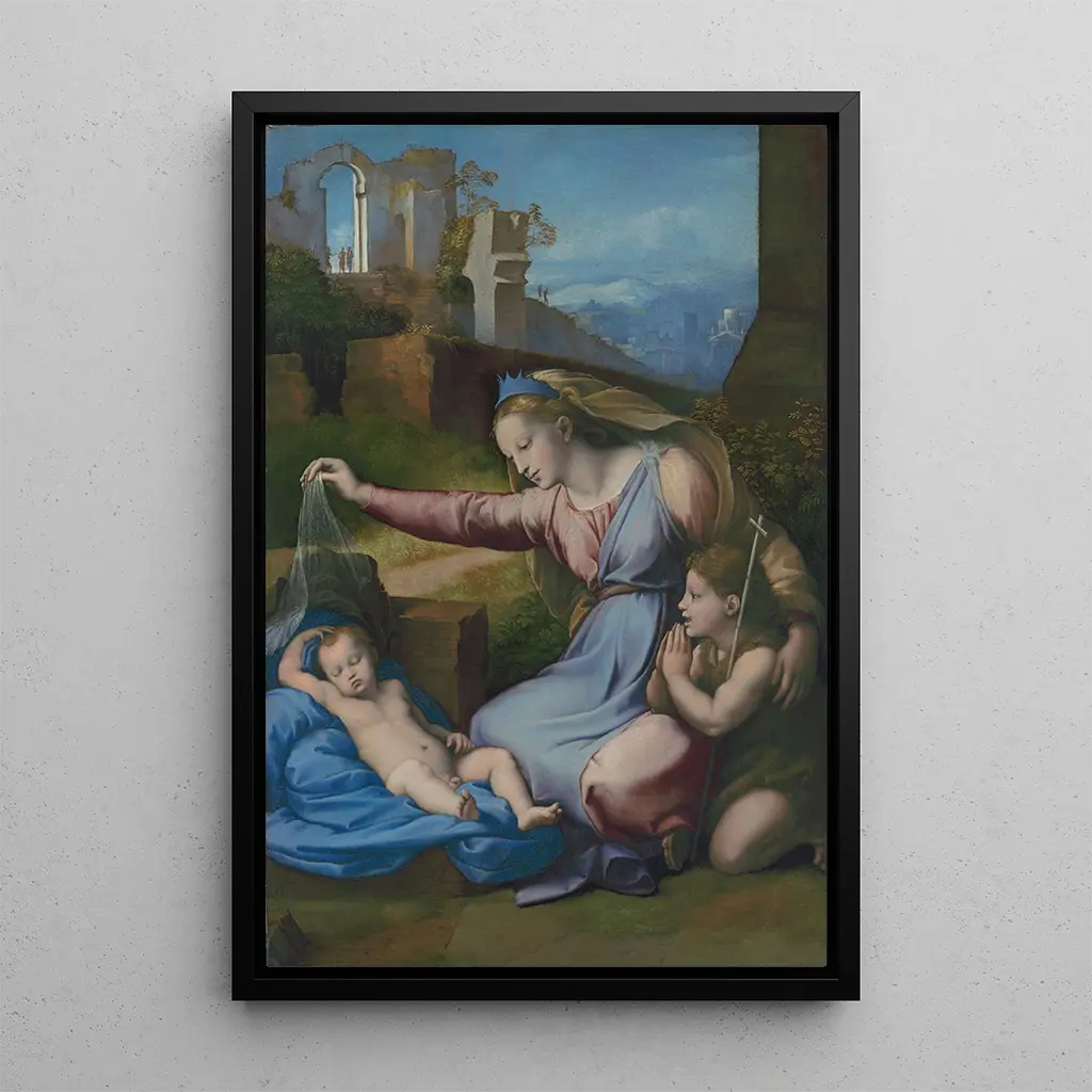 La Madone au diadème bleu, œuvre emblématique de Raphaël, est une représentation sublime de la Vierge Marie, couronnée d'une beauté céleste. Les teintes de bleu profond et d'or qui ornent le diadème contrastent délicatement avec les tons chauds de la chair, créant une atmosphère à la fois majestueuse et intime. La posture de la Vierge, tenant tendrement l'Enfant Jésus, évoque une connexion spirituelle et humaine, tandis que les détails raffinés des drapés et des visages ajoutent une dimension de profondeur émotionnelle à cette toile. Cette œuvre incarne l'harmonie et la paix, caractéristiques du style de Raphaël.