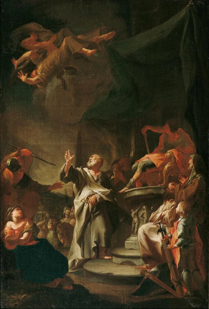 Paul Troger, verksam på 1700-talet, är känd för sin flammande barockstil och dramatiska kompositioner. Utbildad i en konstnärlig rik miljö, påverkades han av de stora italienska mästarna, vilket återspeglas i hans djärva användning av ljus och skugga. Hans verk, ofta fyllda av religiöst symbolik, vittnar om vikten av tro och moral i hans tid. Troger lyckades etablera sig som en framstående konstnär i den österrikiska konstscenen, och La Chute du magicien Simon är ett utmärkt exempel, som visar hans förmåga att fånga dramatiska spänningsmoment.