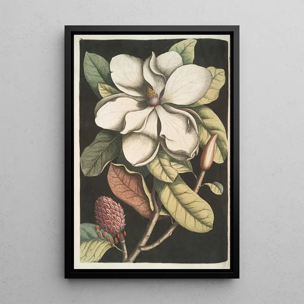 La konsttryck de Magnolia altissima, également connue sous le nom de laurier de Caroline, évoque une atmosphère de sérénité et de beauté naturelle. Les couleurs douces et les détails minutieux de cette œuvre capturent la majesté de la plante, avec des nuances de vert éclatant et des touches de blanc pur. La technique de l’aquarelle, utilisée par Mark Catesby, permet de rendre la délicatesse des pétales et la richesse des feuillages. Cette toile invite à une contemplation paisible, où chaque élément semble vibrer d'une vie propre, transportant le spectateur dans un jardin luxuriant.