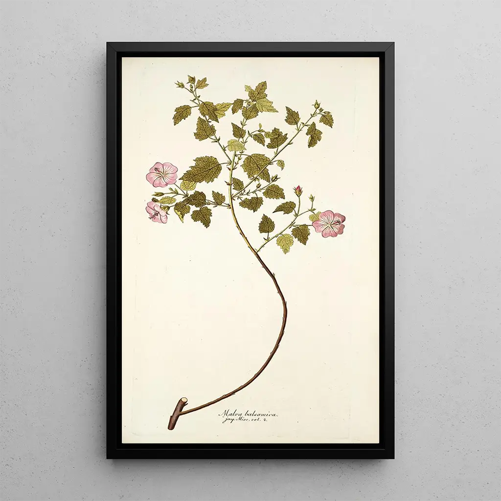 Den konsttryck av Malva balsamica, skapad av Nikolaus Joseph Freiherr von Jacquin, fördjupar oss i en värld av mjukhet och precision. Detta konsttryck, rikt på detaljer, framhäver växtens skönhet med pastellfärger som framkallar lugn. Nyansen av grönt och rosa blandas harmoniskt och skapar en lugnande atmosfär. Akvarelltekniken, använd med mästerskap, gör det möjligt att återge genomskinligheten hos blommans kronblad och texturen på bladen, vilket erbjuder en verklig inbjudan till att betrakta naturen. Varje element är noggrant återgivet, vilket vittnar om en uppmärksam och respektfull blick mot växtvärlden.