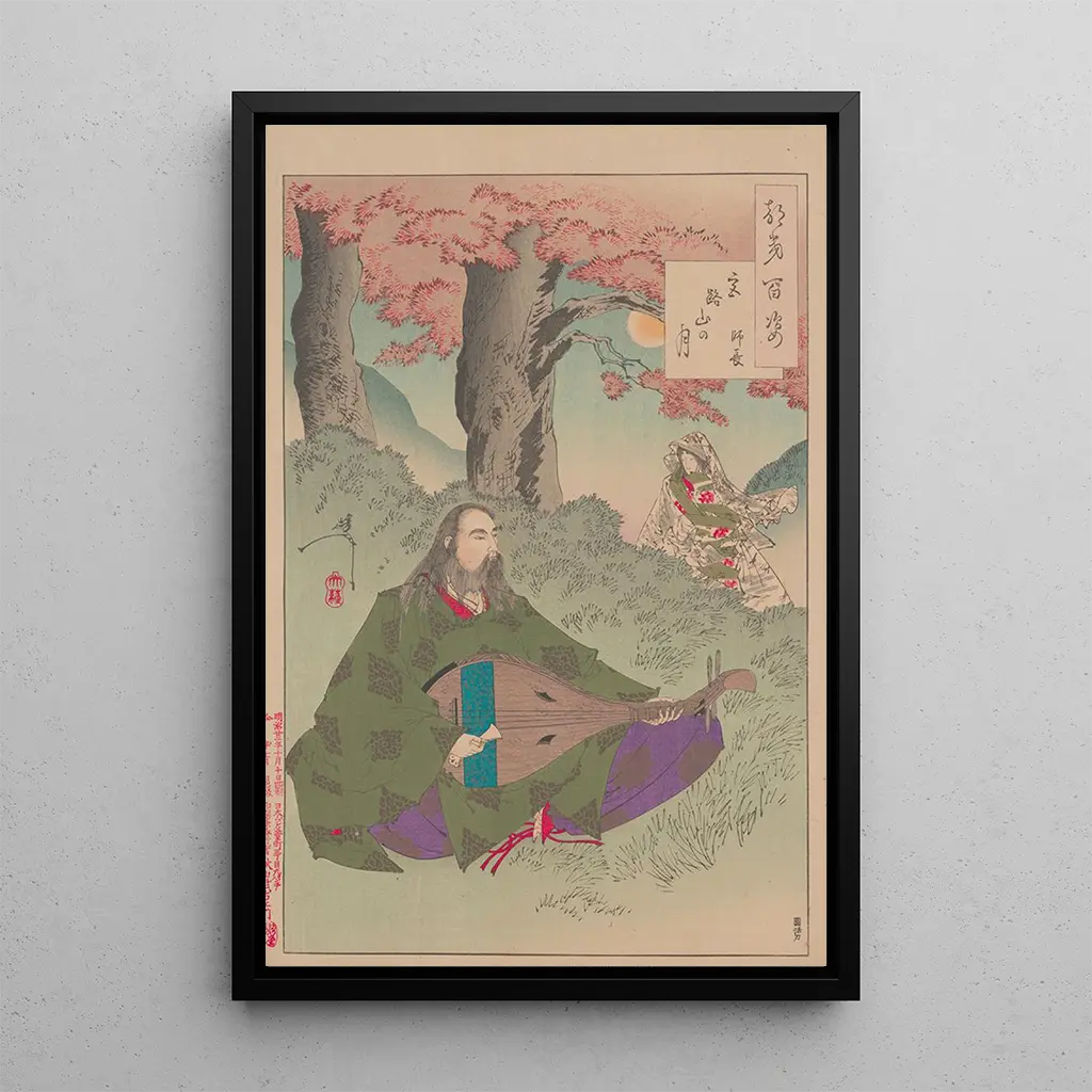 La konsttryck de l'œuvre "Lune du mont Miyaji" de Tsukioka Yoshitoshi évoque une scène nocturne empreinte de sérénité. Les teintes douces de bleu et d'argent se mêlent pour créer une atmosphère mystique, où la lune éclaire délicatement le paysage. La composition est soigneusement équilibrée, avec des éléments naturels qui se fondent harmonieusement dans le décor. Les détails minutieux des arbres et des montagnes ajoutent une profondeur visuelle, invitant le spectateur à plonger dans cette vision poétique du Japon traditionnel. Chaque coup de pinceau semble capturer l'essence d'un moment fugace, suspendu entre rêve et réalité.
