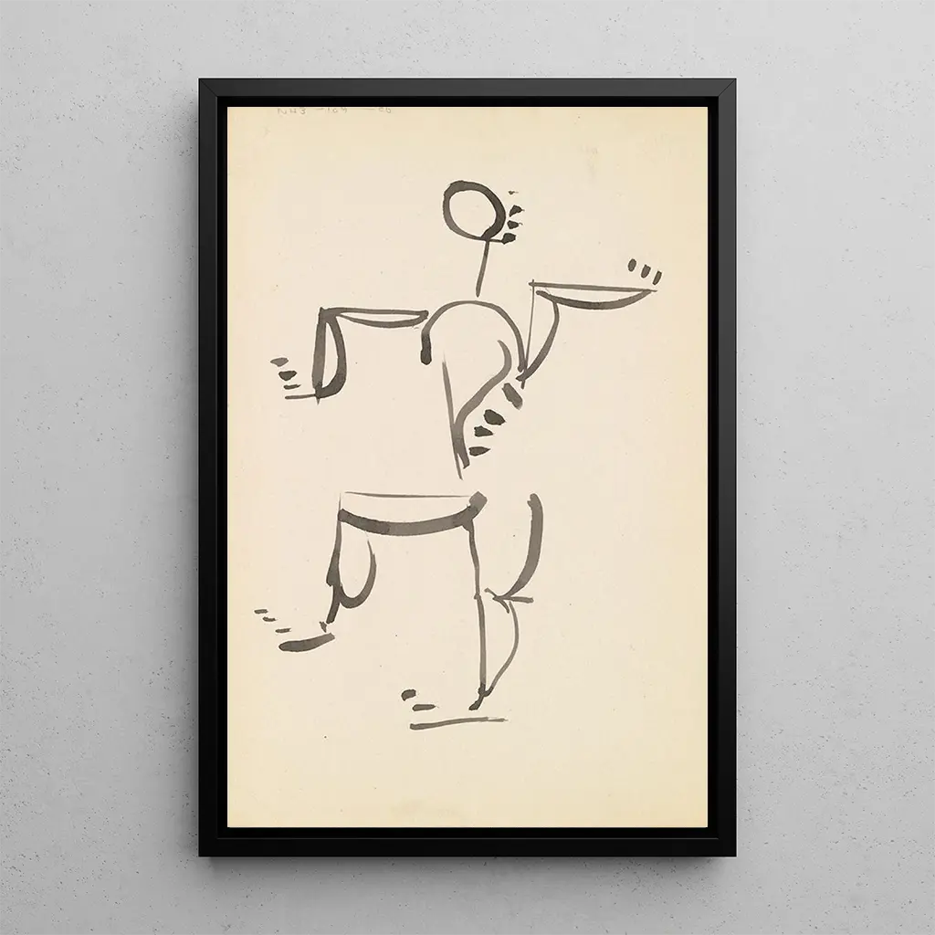 Konsttrycket av den Figur manlig dansande av Henri Gaudier-Brzeska framkallar en slående dynamik, där skulpturen verkar fånga energin i ett flyktigt ögonblick. De flytande linjerna och de stiliserade volymerna kombineras för att ge liv åt en fullständigt aktiv silhuett, vilket avslöjar konstnärens skicklighet i att arbeta med materialet. Nyansen av bränd lera, både varm och organisk, förstärker intrycket av vitalitet, medan dansarens hållning framkallar en tidlös grace. Detta verk, både modernt och tidlöst, inbjuder till att betrakta rörelse och kroppslig skönhet.