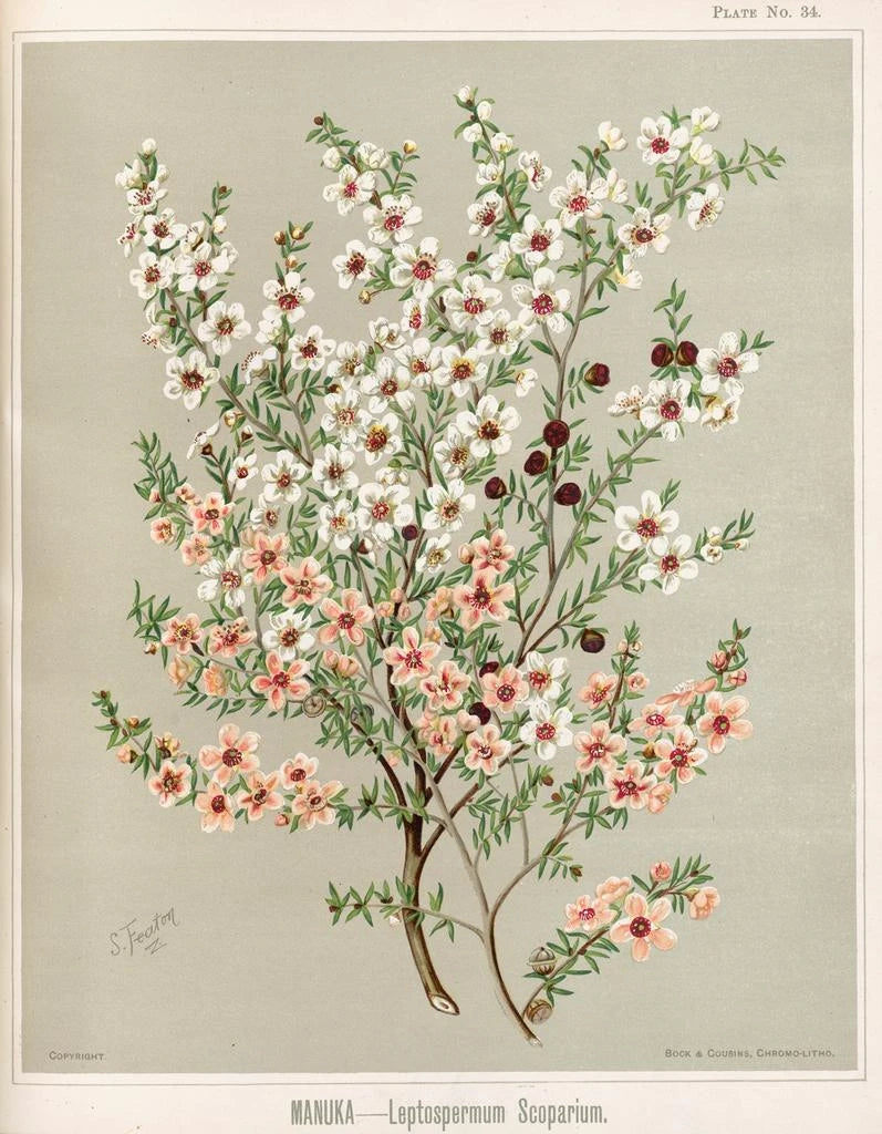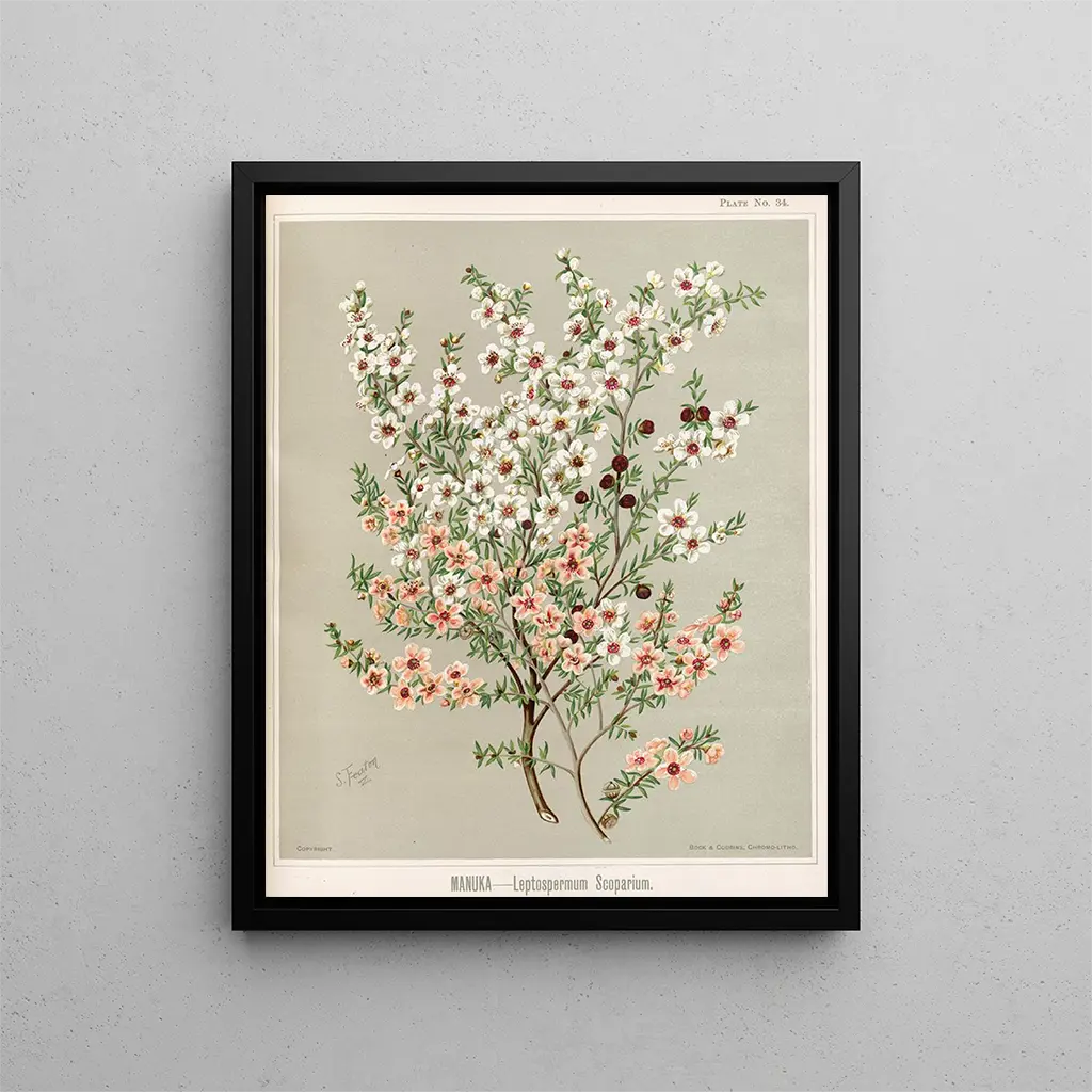 I 'Manuka Leptospermum scoparium' illustrerar Sarah Featon med briljans denna växt, som är allmänt erkänd för sina medicinska egenskaper och sin betydelse i māori-kulturen. Featon, som botanisk konstnär från 1800-talet, har lyckats kombinera vetenskaplig precision med konstnärlig känslighet, och skapar verk som överträffar enkel illustration. Skönheten hos manuka, med sina delikata blommor och aromatiska blad, fångas med en noggrannhet som tilltalar ögat och stimulerar fantasin. Detta konsttryck är inte bara en hyllning till Nya Zeelands biologiska mångfald, utan också en inbjudan att utforska kopplingarna mellan natur och kultur. I en modern miljö kan detta konsttryck tillföra en känsla av äkthet och lugn. Konsttrycket av denna illustration finns att upptäcka på Artem Legrand.