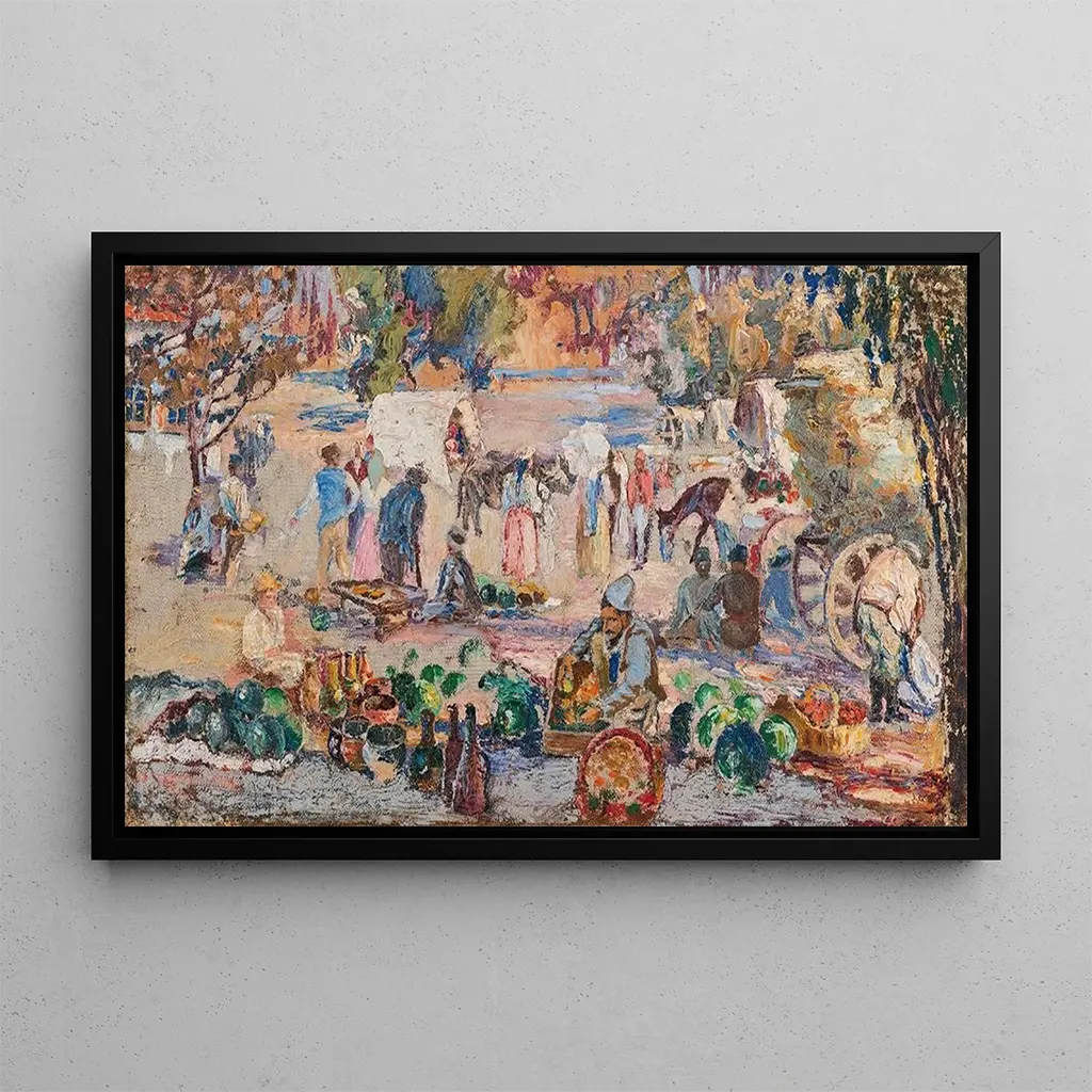 Dans cette reproduction du tableau Marché de Crimée, Nikolai Ivanovich Kulbin nous plonge au cœur d'une scène animée où les couleurs éclatantes et les détails minutieux capturent l'essence de la vie sur le marché. Les personnages, vêtus de costumes traditionnels, s'affairent autour des étals chargés de produits locaux, tandis que la lumière joue sur les surfaces, créant une atmosphère chaleureuse et accueillante. La technique de Kulbin, qui mêle habilement le réalisme et une touche d'impressionnisme, donne vie à cette composition, invitant le spectateur à s'imaginer dans ce lieu vibrant d'échanges et de rencontres.