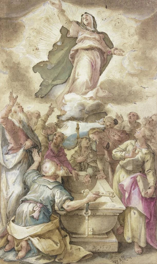 Konsttrycket av Assumtion av Maria av Hans Rottenhammer är ett verk som hyllar den himmelska stigningen av Jungfru Maria. De strålande färgerna och de rörliga figurerna skapar en slående dynamik, medan det gyllene ljuset omsluter scenen i en gudomlig aura. Kompositionen, rik på detaljer, visar Maria omgiven av änglar, vilket symboliserar hennes uppstigning till paradiset. De flytande draperingarna och karaktärernas uttryck tillför en emotionell djup, och bjuder in betraktaren att känna glädjen och vördnaden för detta heliga ögonblick. Denna målning är en sann hyllning till andlighet och skönhet.