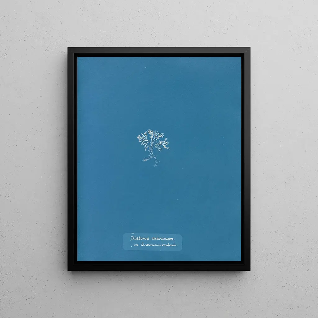 Särprägeln hos "Marina diatoméer på Ceramium röd" ligger i dess unika teknik, som kombinerar cyanotypens process med en delikat komposition. Genom att använda marina alger som stöd skapar Atkins en visuell harmoni där organiska former blandas med nyanser av djupt blått och lysande rött. Denna slående kontrast fångar omedelbart blickar och inbjuder till noggrann eftertanke. Diatoméerna, dessa mikroorganismer av en oväntad skönhet, lyfts fram här med vetenskaplig precision, samtidigt som de behåller en obestridd estetisk dimension. Varje detalj, varje textur, är noggrant återgiven, vilket vittnar om en noggrann observation och ett djupt respekt för naturen. Verket nöjer sig inte med att vara en enkel representation; det blir en inbjudan att utforska mysterierna i det vattenlevande livet.