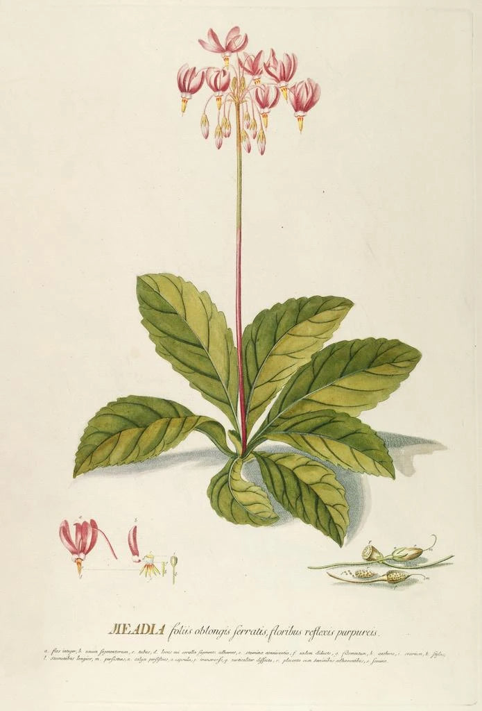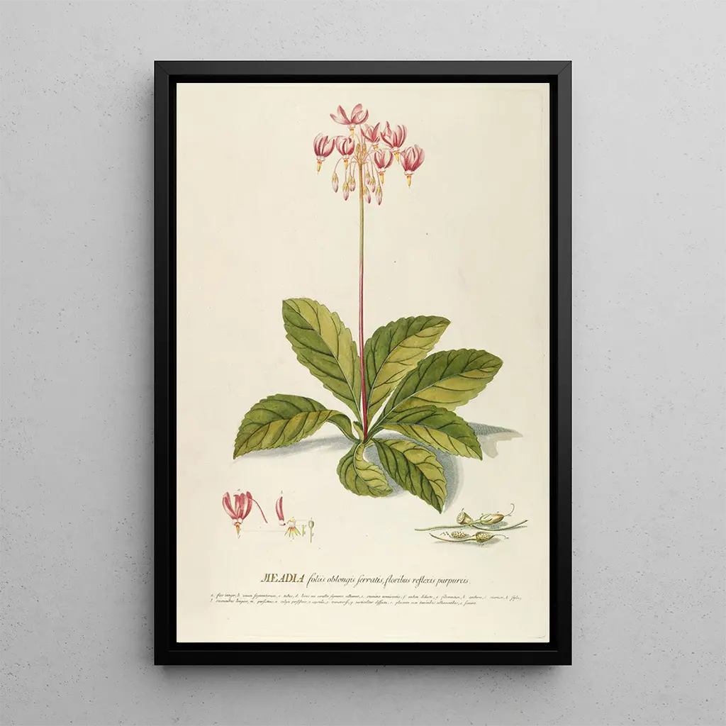 Meadia-konsttryck av Georg Dionysius Ehret är en verklig hyllning till den blomstrande rikedom. Detta verk, utfört med en enastående botanisk precision, avslöjar livfulla blommor i strålande färger. Nyansen av grönt och rosa flätas harmoniskt samman och skapar en atmosfär av lugn och förundran. Akvarelltekniken, använd med finess, fångar petalernas ömtålighet och bladenas ljusstyrka, vilket inbjuder betraktaren att fördjupa sig i en värld där naturen är drottning. Varje detalj är noggrant återgiven, vilket vittnar om en djup kärlek till växtvärlden.