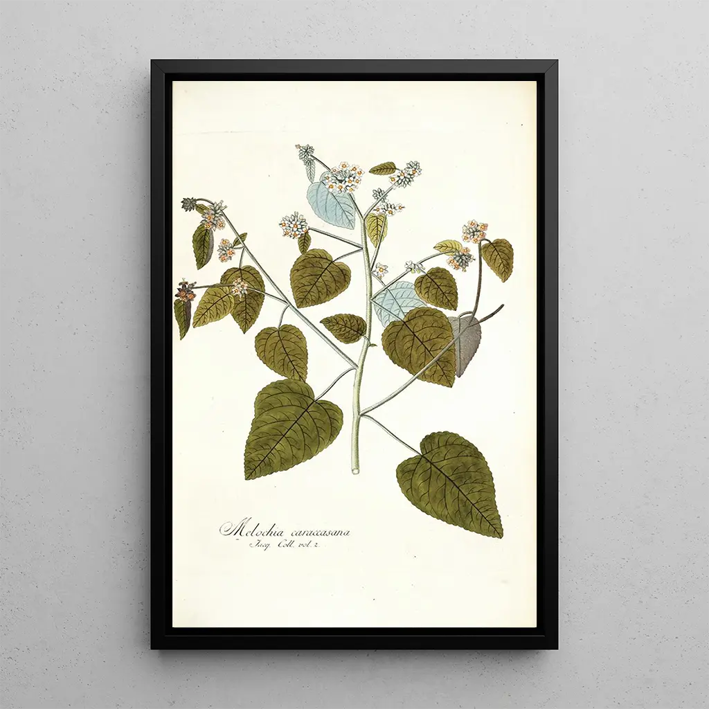 Konsttrycket av Melochia caraccasana, utfört av Nikolaus Joseph Freiherr von Jacquin, fördjupar oss i en rik och livfull växtvärld. Detta verk, kännetecknat av sina gröna nyanser och sina delikata gula toner, framkallar värmen från tropiska klimat. Akvarelltekniken, använd med finhet, hyllar lättheten och genomskinligheten hos bladen. Atmosfären som avtecknar sig i denna målning är både lugnande och inspirerande, och bjuder in betraktaren att fördjupa sig i den frodiga naturen och att uppskatta de botaniska detaljerna.
