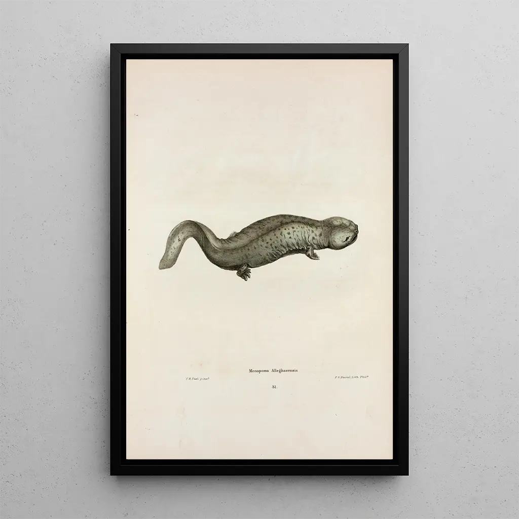 Konsttrycket av Menopome des Alleghanys är ett perfekt dekorativt föremål för att försköna ditt vardagsrum, kontor eller sovrum. Dess utskriftskvalitet garanterar en anmärkningsvärt trogen återgivning av färger och detaljer i originalet, vilket gör att du fullt ut kan uppskatta skönheten i detta konsttryck. Genom att integrera detta konsttryck i din inredning tillför du en touch av elegans och lugn, samtidigt som du hyllar den vattenlevande faunans rikedom. Oavsett om du är konstälskare eller naturentusiast, kommer denna väggbonad att tilltala med sin estetiska attraktion och fascinerande historia.