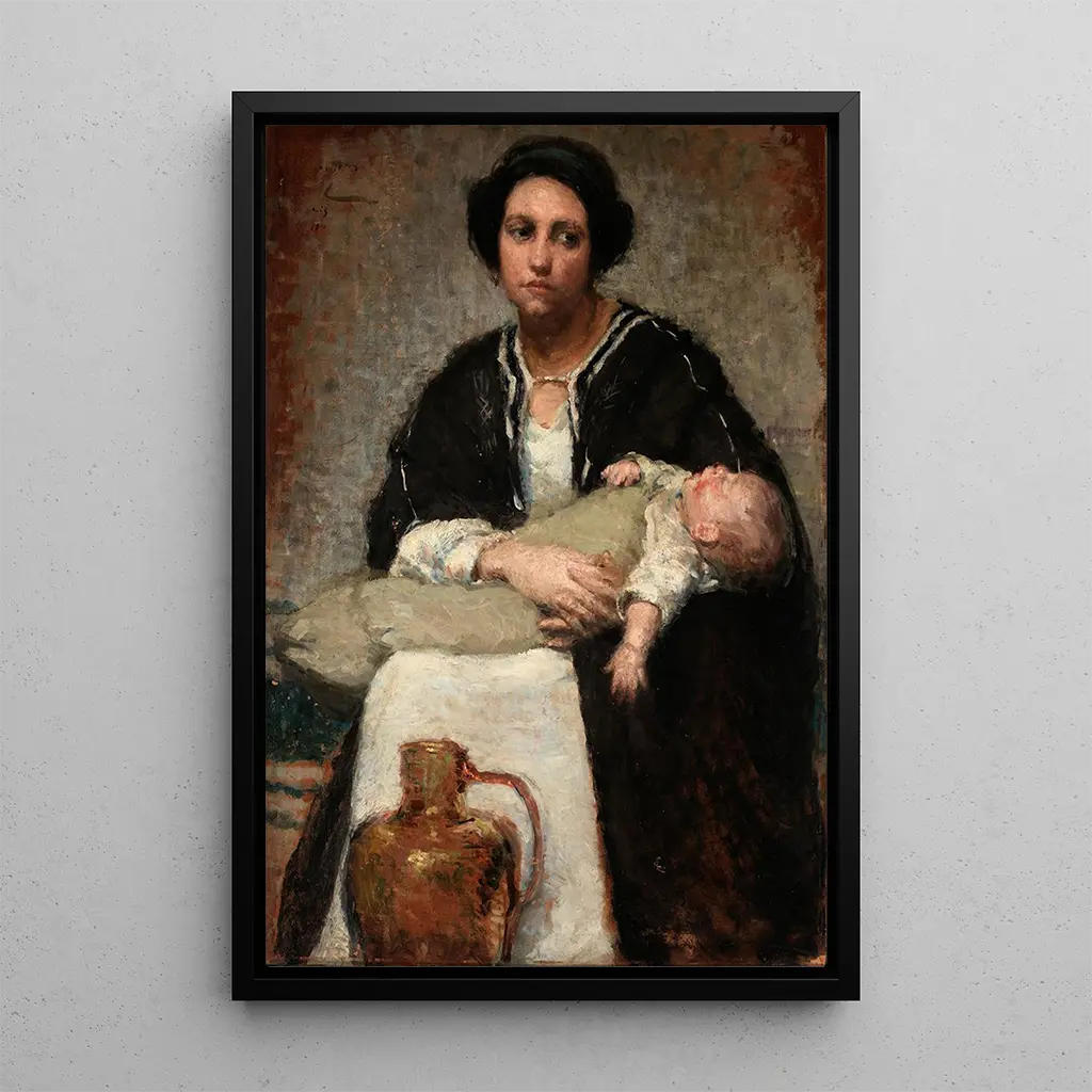 " mamma och bebis som sover" av Alice Pike Barney är ett rörande konsttryck som illustrerar skönheten i familjebanden. Detta konsttryck, utfört med en enastående känslighet, skildrar en mamma som ömt vakar över sitt sovande barn. De mjuka färgerna och de rundade formerna skapar en atmosfär av fred och trygghet. Det mjuka ljuset som omsluter figurerna förstärker känslan av värme och intimitet. Barney lyckas bevara ett flyktigt ögonblick av ömhet, vilket inbjuder varje betraktare att känna den ovillkorliga kärlek en mamma har för sitt barn.