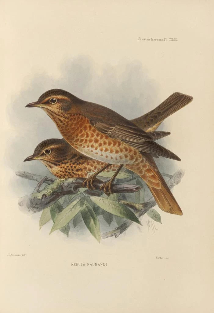 Henry Seebohm, en ikonisk figur inom ornitologi under 1800-talet, lyckades förena sin kärlek till fåglar med sitt konstnärliga talang. Hans verk befinner sig i skärningspunkten mellan konst och vetenskap, och speglar de framsteg som gjordes under hans tid inom ornitologiska studier. Som passionerad observatör reste Seebohm världen runt för att fånga fågelrikets mångfald, och på så sätt påverkade många konstnärer och naturalister. Konsttrycket av Merula Naumanni är ett perfekt exempel på hans noggranna metod och önskan att förmedla arternas skönhet genom konst.