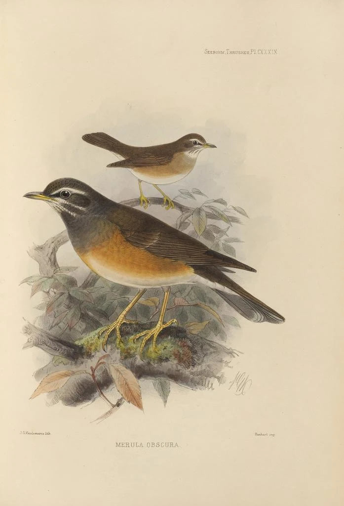 Henry Seebohm, naturalist och ornitolog från 1800-talet, lyckades kombinera sin passion för fåglar med sin konstnärliga talang. Aktiv under en tid då studiet av fauna växte i betydelse, påverkades han av tidens naturalistiska strömningar och strävade efter att skildra naturens skönhet med precision. Hans verk, inklusive Merula Obscura, vittnar om hans engagemang för vetenskap och konst. Genom att fånga sällsynta och ofta okända arter bidrog Seebohm till att utbilda allmänheten om biologisk mångfald, samtidigt som han lämnade ett varaktigt konstnärligt arv.