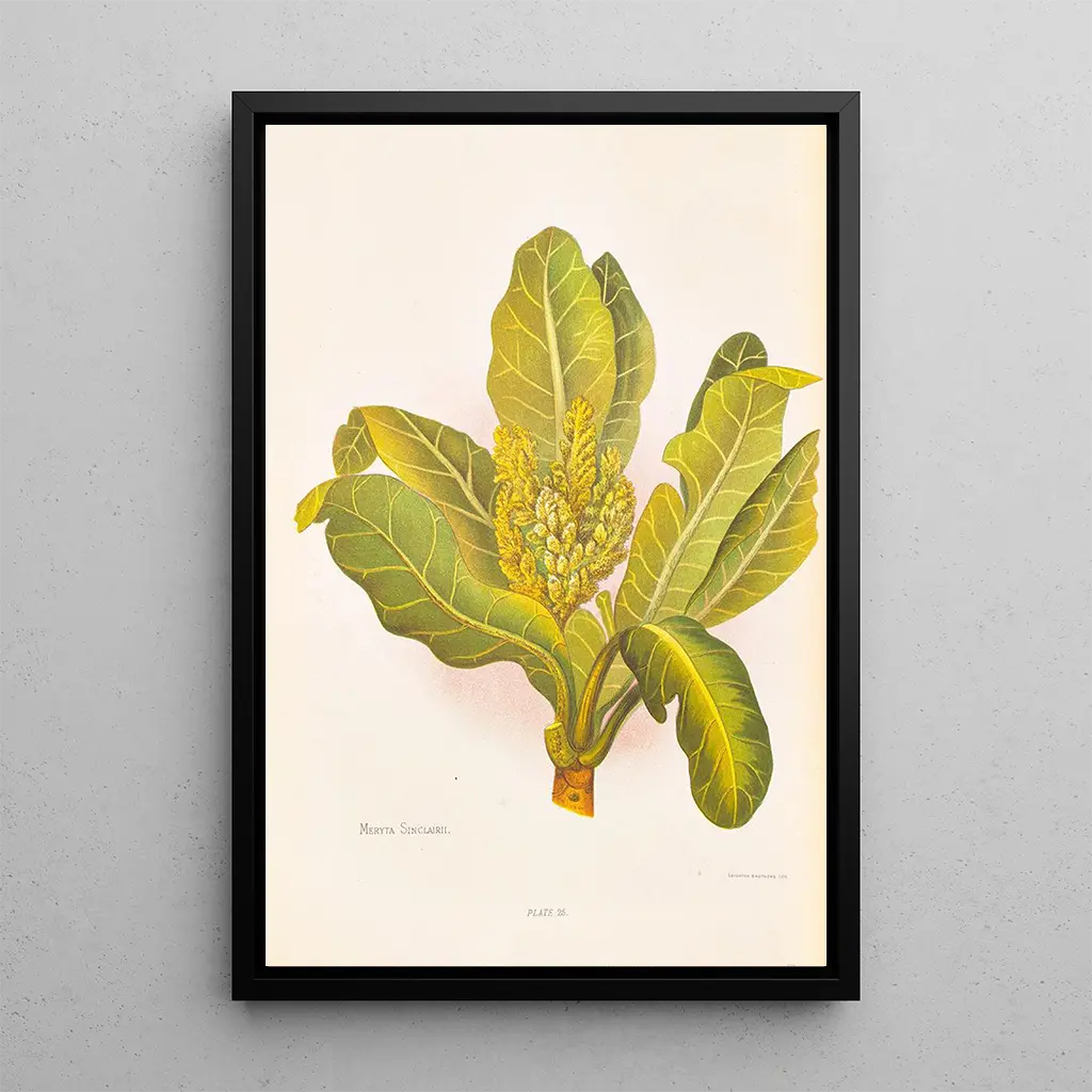 Konsttrycket av Meryta sinclairii är ett perfekt val för att försköna ditt hem, oavsett om det är i ett vardagsrum, ett kontor eller ett sovrum. Den livfulla färgpaletten och det fängslande motivet tillför en känsla av friskhet och vitalitet till vilket utrymme som helst. Kvaliteten på utskriften garanterar trohet mot originalverket, vilket gör det möjligt att njuta av de minuciosa detaljerna och färgernas ljusstyrka. Genom att integrera detta konsttryck i din inredning skapar du en lugn och inspirerande atmosfär, samtidigt som du hyllar naturens skönhet genom konst.