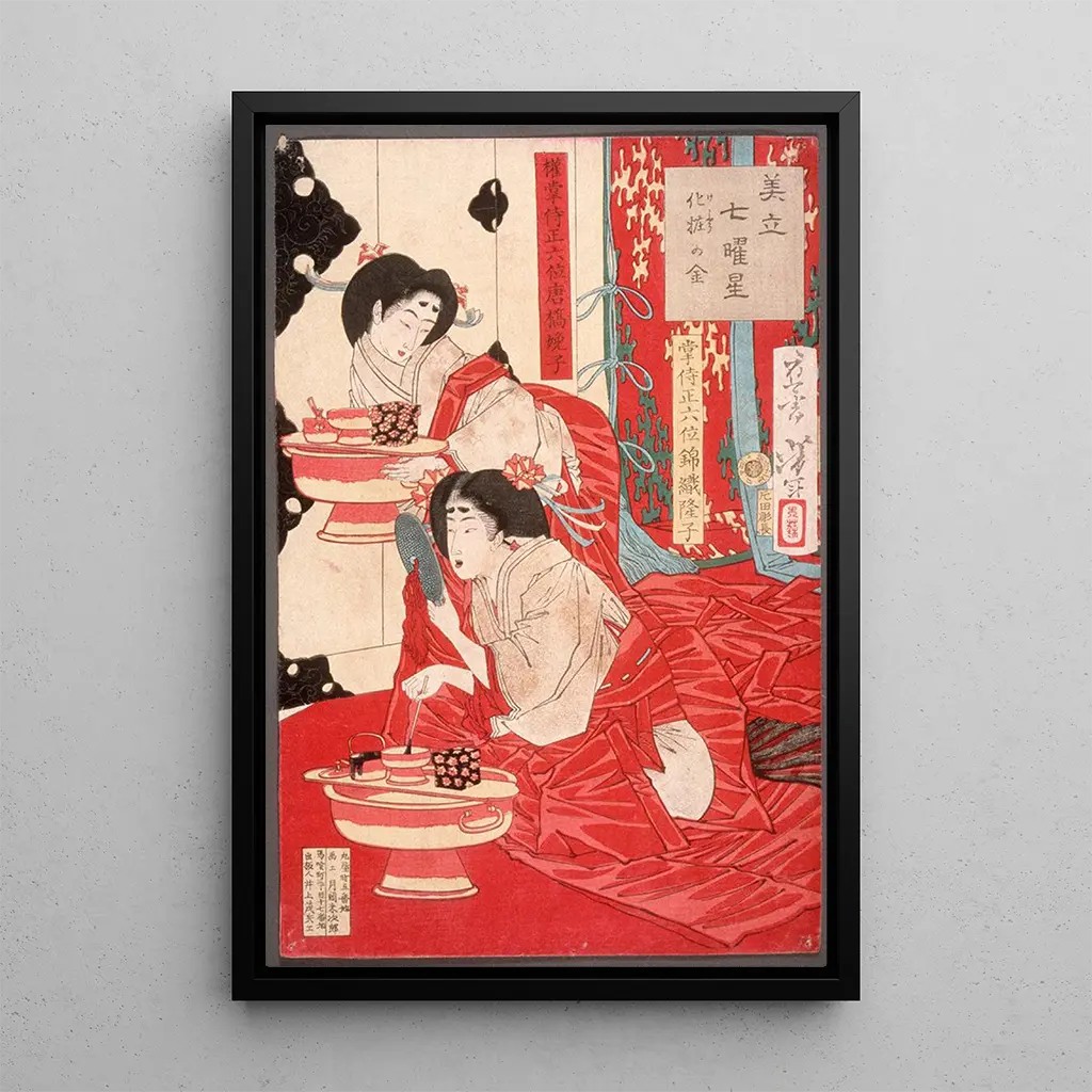 I verket "Metall för att mörka tänderna" fördjupar sig Tsukioka Yoshitoshi i en fascinerande värld där skönhet och kultur blandas. Detta konsttryck, fyllt av mörka färger och noggranna detaljer, återspeglar en traditionell japansk praxis, nämligen att mörka tänderna, en symbol för skönhet och social status. Tekniken med ukiyo-e på papper ger denna målning en atmosfär som är både mystisk och fängslande. Nyansen av svart och guld, samt de delikata mönstren, inbjuder till en djup reflektion över denna unika sedvänja.