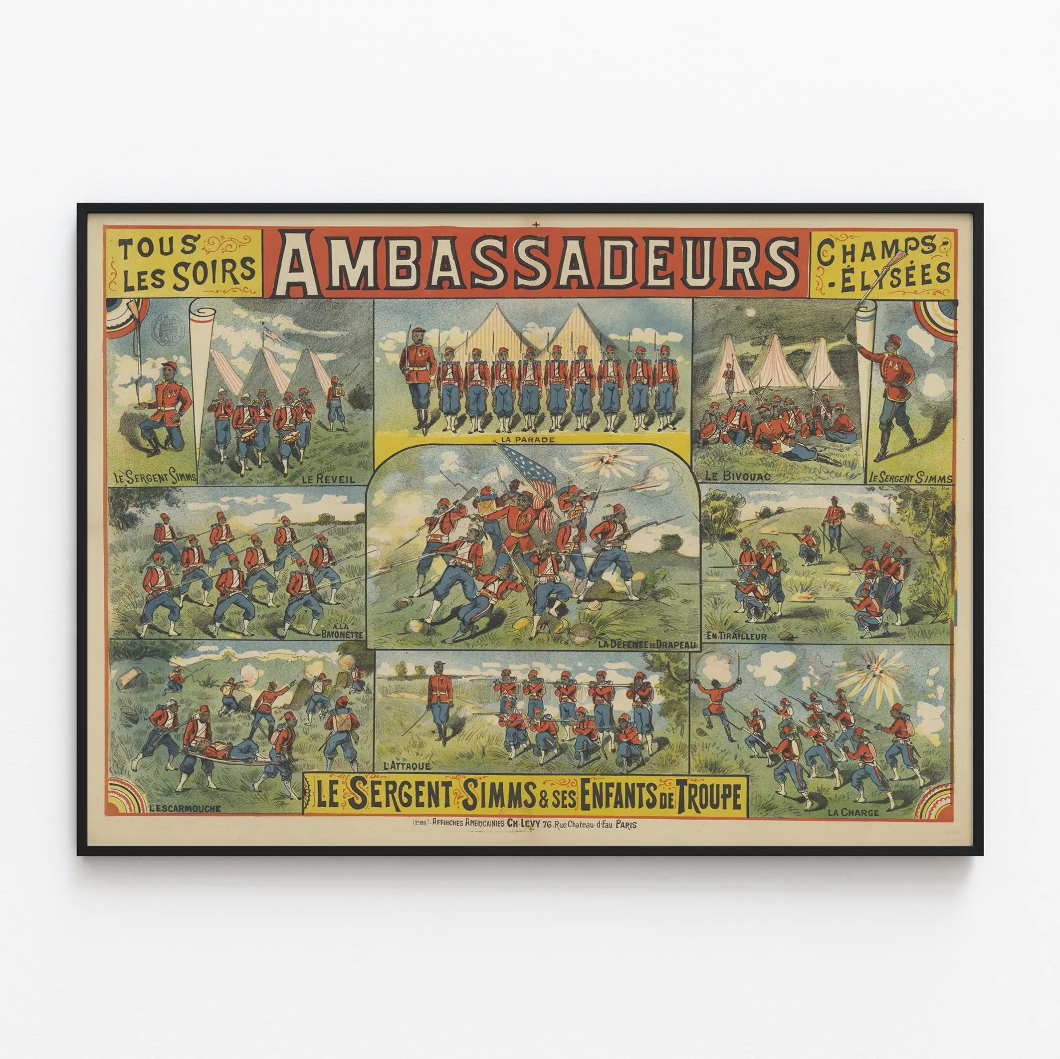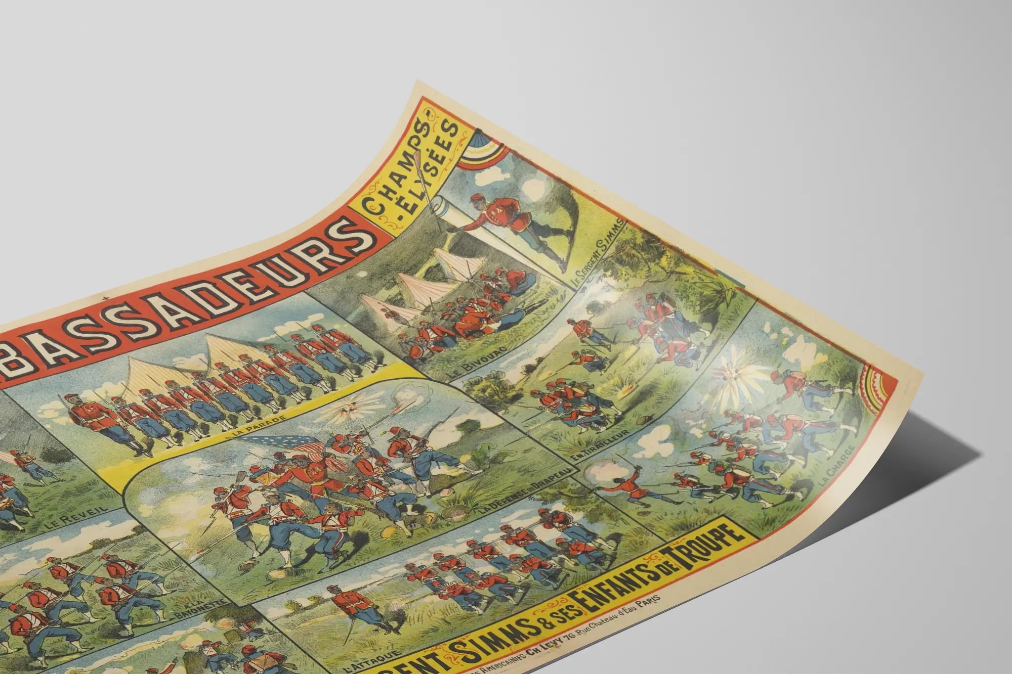Denna vintageaffisch föreställer en livlig militärscen med titeln « Sersjant Simms & hans truppmedlemmar ». Bestående av flera illustrativa vignetter, väcker denna väggdekoration liv i soldaternas vardag genom olika aktiviteter: väckning, parad, lägereld, anfall, skärmytsling och försvar av flaggan. Varje vignett framhäver en grupp soldater i röda och blå uniformer, beväpnade och i full fart, vilket skildrar militär träning och strider. Den grafiska stilen präglas av en retro färgskala med nyanser av gult, rött, blått och grönt, vilket ger en varm och äkta atmosfär till detta dekorativa stycke. Affischens titel är inskriven upptill och nertill, vilket förstärker det militära temat och närvaron av sersjant Simms, den centrala figuren i kompositionen. Denna historiska poster passar perfekt som en originell väggdekoration, särskilt för en vintageatmosfär eller en värld inspirerad av militärhistoria. Den passar lätt in i ett vardagsrum, ett kontor eller ett personligt utrymme där charmen av gamla affischer värdesätts. Denna vintageaffisch, med sina många illustrativa scener, utgör ett fängslande konstverk tack vare sitt visuella berättande och sin klassiska estetik: ett perfekt val för entusiaster av vintageväggdekorationer och älskare av gammal militär ikonografi.
