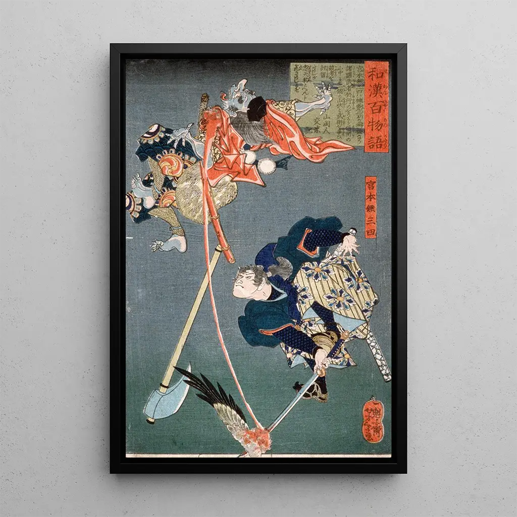 Dans cette œuvre saisissante, Tsukioka Yoshitoshi illustre un moment épique où Miyamoto Musashi se confronte à un tengu, créature mythologique du folklore japonais. La scène, riche en couleurs vibrantes et en détails minutieux, évoque un combat intense, où la maîtrise du sabre de Musashi est mise à l'épreuve. Les nuances de rouge et de bleu, associées à des motifs dynamiques, créent une ambiance à la fois mystique et dramatique. Cette konsttryck av målningen transporterar åskådaren till en värld där legend och verklighet möts, och inbjuder till att utforska de heroiska berättelserna från det gamla Japan.