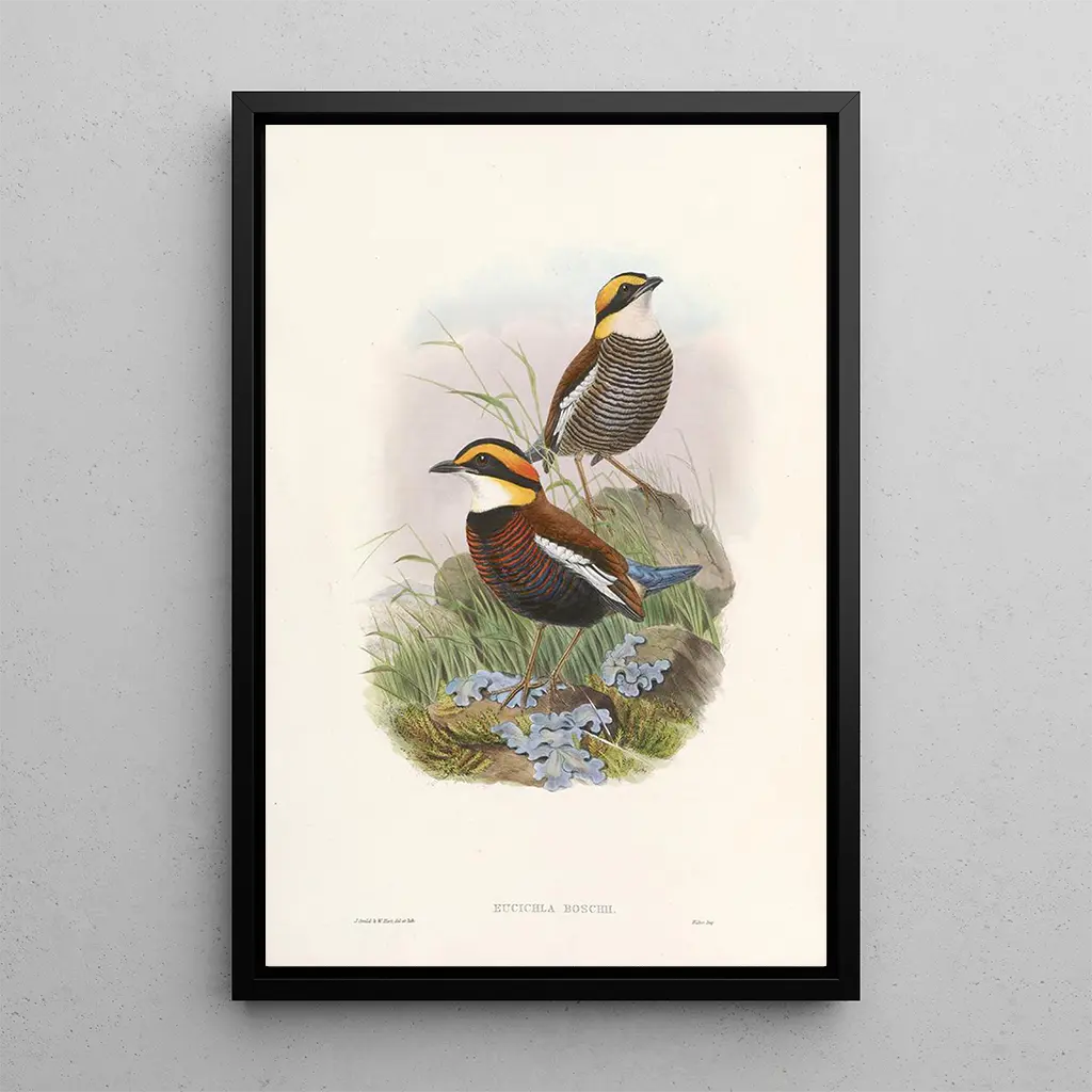 John Gould, en ikonisk figur från 1800-talet, revolutionerade fågelillustrationen med sin vetenskapliga och konstnärliga metod. Hans verk, inklusive konsttrycket Monographie des Pittidae, vittnar om hans engagemang för att troget återge de fågelarter han mötte under sina resor. Påverkad av tidens naturalistiska upptäckter, lyckades Gould kombinera vetenskaplig noggrannhet med konstnärlig känslighet, och skapade därigenom verk som blivit referenser inom ornitologin. Hans arv består, och fortsätter att inspirera många konstnärer och forskare världen över.