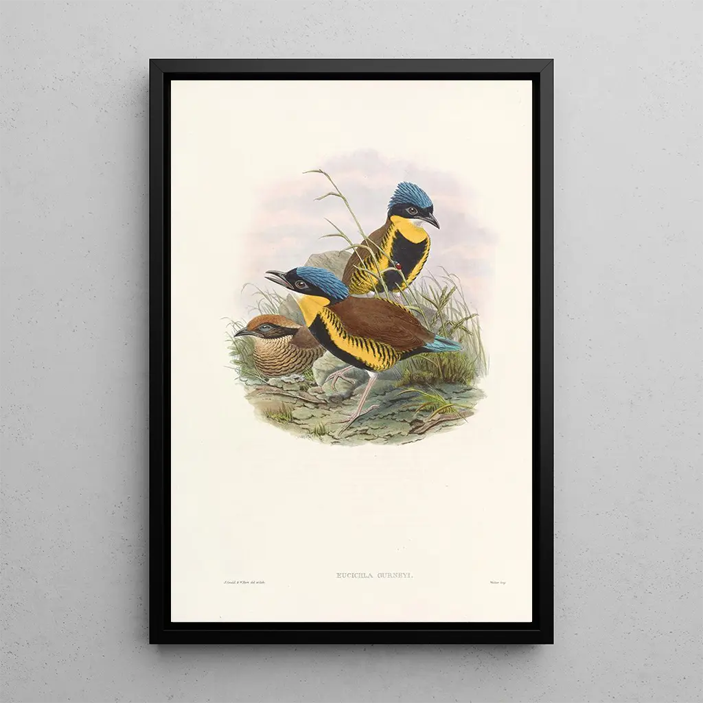 John Gould, en framstående figur från 1800-talet, revolutionerade ornitologisk illustration med sin konstnärliga och vetenskapliga metod. Hans passion för fåglar ledde till skapandet av verk med oöverträffad precision, som Konsttrycket Monografi av Pittidae. Inspirerad av sin tids utforskningar lyckades Gould fånga essensen av de arter han avbildade, hyllande deras skönhet samtidigt som han bidrog till vetenskaplig kunskap. Hans karakteristiska stil, som kombinerar realism och känslighet, har lämnat ett bestående avtryck inom konst och vetenskap, vilket gör honom till en pionjär inom sitt område.