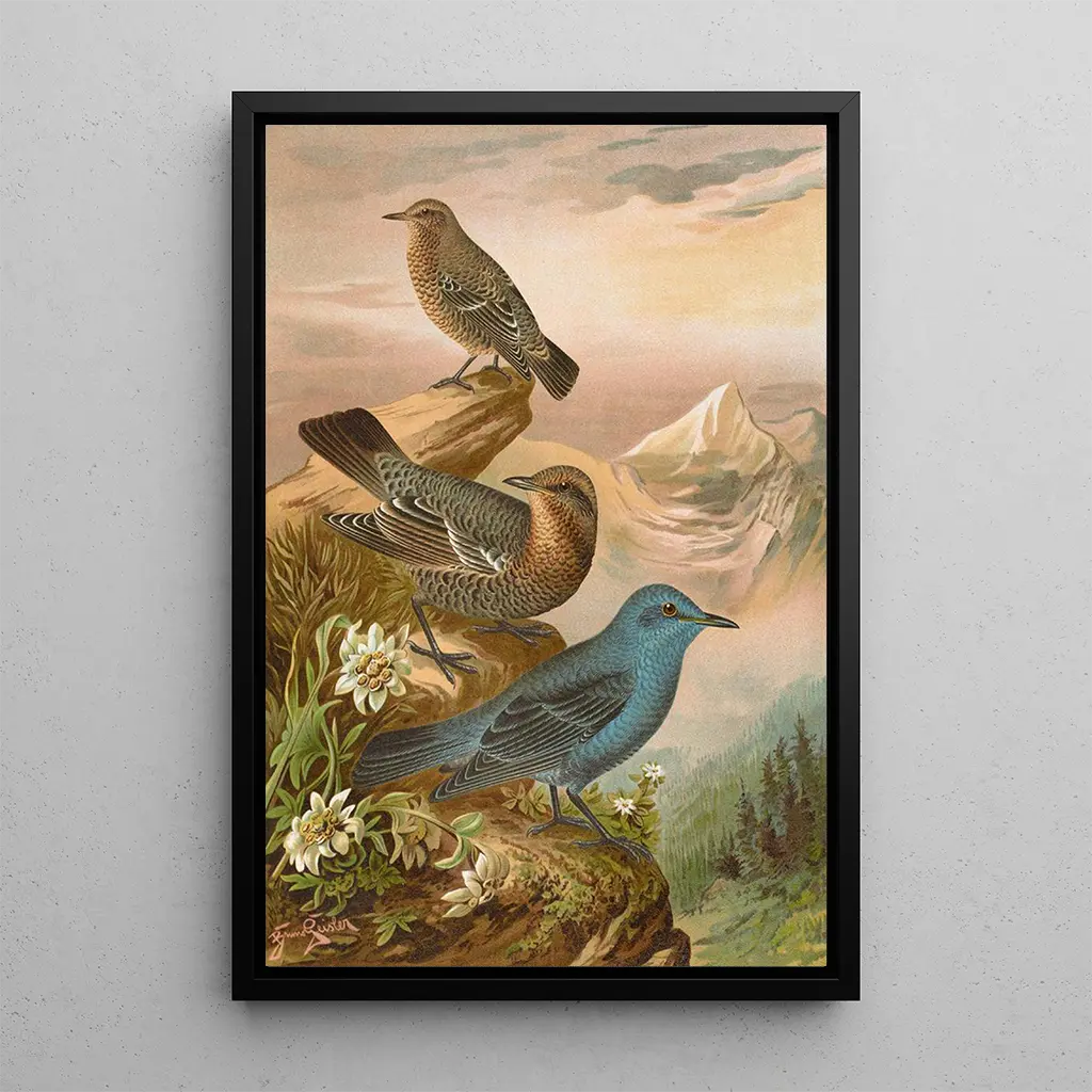Konsttrycket Monticola cyanus, även utfört av Johann Friedrich Naumann, erbjuder en fängslande syn av denna fågel med glänsande fjäderdräkt. Med sina nyanser av klarblått och vitt drar målningen omedelbart till sig uppmärksamheten och framkallar lättheten i himlen. Konstnärens teknik, som kombinerar akvarell och noggrann teckning, hyllar den naturliga skönheten hos denna fågel. Atmosfären som utstrålar verket är både glad och lugnande, inbjuder till flykt och beundran av fågelfaunan.