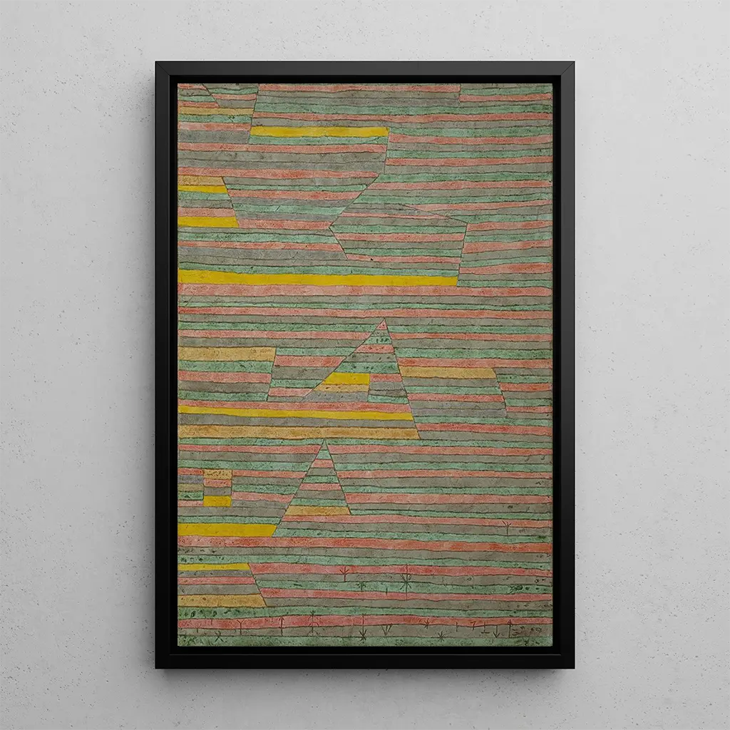 I "Monuments à G" fördjupar Paul Klee oss i en värld där geometriska former flätas samman med en palett av livfulla färger. De slingrande linjerna och de abstrakta mönstren skapar en atmosfär som är både lekfull och kontemplativ. Denna målning, karakteristisk för Klees unika stil, framkallar ett imaginärt landskap där varje element tycks dansa till rytmen av en tyst melodi. De varma och kalla nyanserna möts i harmoni och ger en visuell djup som inbjuder till utforskning. Akvarelltekniken, blandad med pastellinslag, förstärker denna känsla av flykt och drömmande, vilket gör detta konsttryck till en verklig inbjudan till eftertanke.