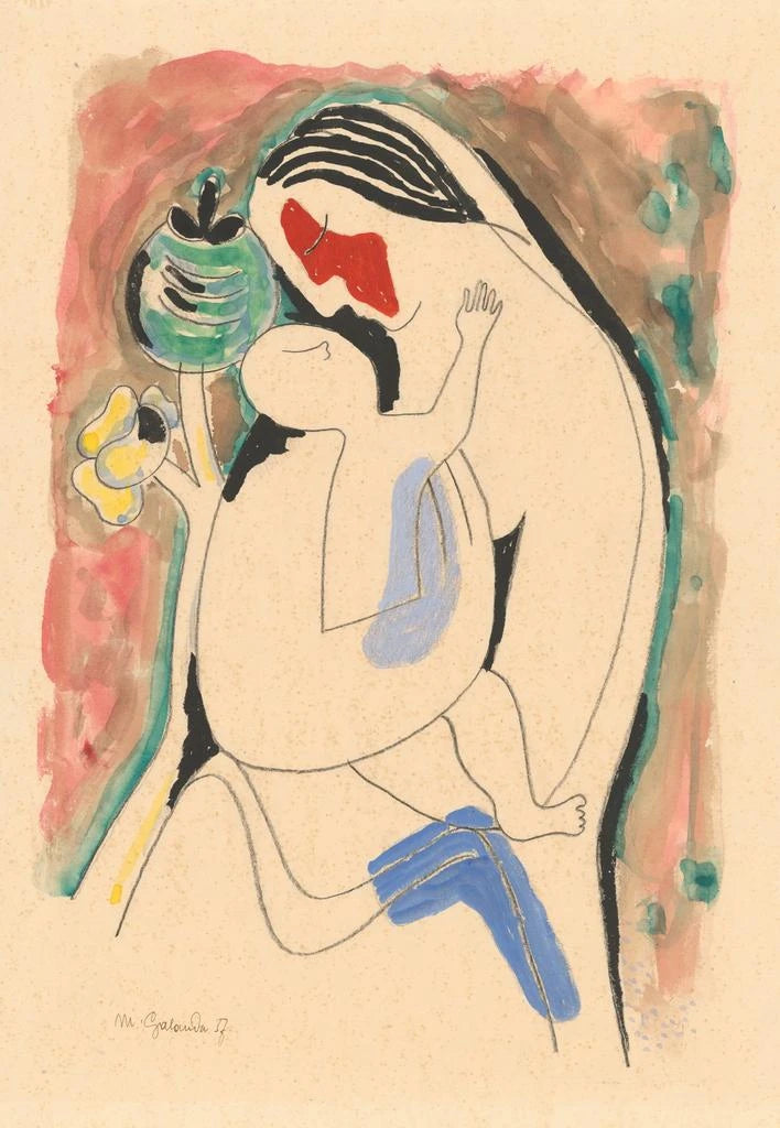 I detta rörande verk fångar Mikuláš Galanda den sötma av ett intimt ögonblick mellan en mamma och hennes barn. Kompositionen är finstämd, framhäver de graciösa kurvorna av figurerna, medan pastellfärger skapar en lugnande atmosfär. Tekniken för målning, som är både flytande och exakt, gör det möjligt att känna värmen av moderskärlek. Blomman, symbol för skönhet och skörhet, tillför en poetisk dimension till scenen och inbjuder betraktaren att fördjupa sig i denna ömhetsfulla relation.