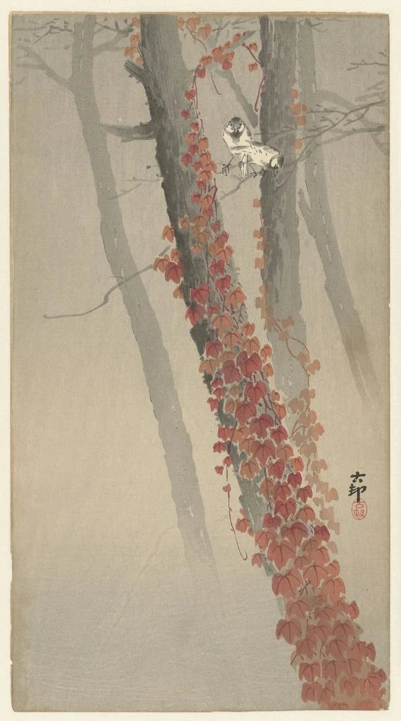 Dans cette konsttryck av målningen Lierre rouge, Ohara Koson fångar själva essensen av naturen med en oöverträffad finhet. Lianbladen, i en strålande röd nyans, flätas graciöst samman och skapar en slående kontrast mot den mer neutrala bakgrunden. Tekniken med ukiyo-e på papper, som är typisk för ukiyo-e, ger konstnären möjlighet att leka med ljus och skugga, vilket ger liv åt varje blad. Atmosfären som utstrålas av detta verk är både lugnande och livfull, och bjuder in betraktaren att fördjupa sig i en värld där naturen uttrycker sig med poetisk intensitet.
