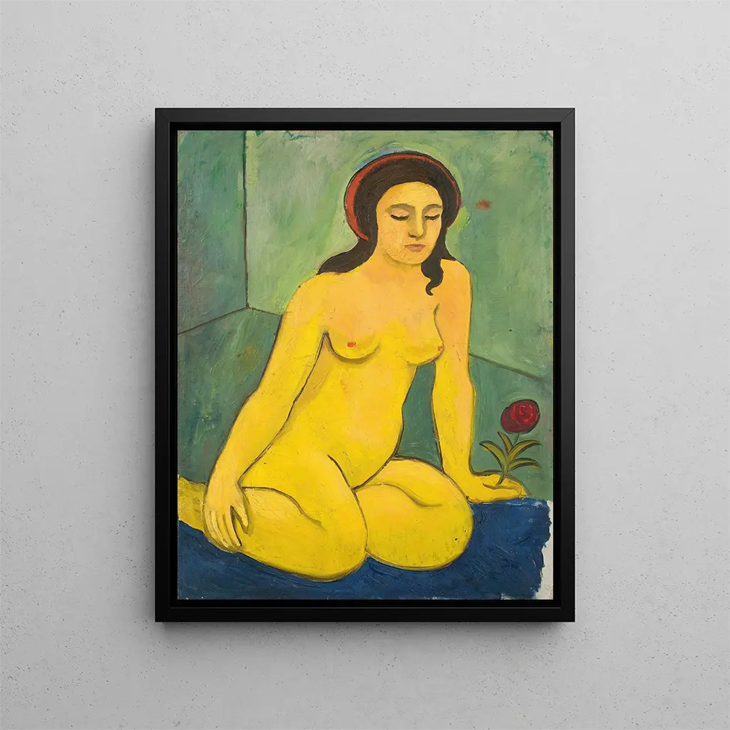 Reproduktion Fille nue avec une fleur rouge - August Macke – Introduktion fängslande Lärredet "Fille nue avec une fleur rouge" av August Macke är ett verk som omedelbart fångar uppmärksamheten med sin djärvhet och sin ömhet. Målad 1909, detta ikoniska verk från den tyska expressionistiska rörelsen utmärker sig genom sin livfulla palett och sitt innovativa sätt att skildra den mänskliga figuren. Framställningen av en ung kvinna, både sårbar och kraftfull, väcker betraktarens frågor om skönhet och livets flyktighet. Den röda blomman hon försiktigt håller i handen verkar symbolisera passion och oskuld, vilket skapar en slående kontrast till hennes kropps nakenhet. Detta verk, fullt av sensualitet och ömhet, inbjuder till en djup och personlig reflektion. Verkets stil och särprägel August Mackes stil kännetecknas av en djärv användning av färger och former, som överskrider den enkla realistiska skildringen för att framkalla rena känslor. I "Fille nue avec une fleur rouge" smälter de livfulla nyanserna, från djupa röda till ljusa gult, harmoniskt samman, vilket skapar en nästan drömlik atmosfär. Kompositionen är noggrant orkestrerad, med fokus på den unga kvinnans silhuett samtidigt som naturliga element förstärker kopplingen mellan människan och hennes omgivning. Macke utmärker sig genom sin förmåga att fånga essensen av sina motiv, och förvandlar nakenheten till en hyllning till livet och skönheten. Verket är en hyllning till kvinnlighet, där varje penseldrag tycks tillföra en vital energi till duken. Konstnären och hans inflytande August Macke, född 1887 i Meschede, är en av de främsta figurerna inom den tyska expressionismen. Hans konstnärliga bana, trots att den tragiskt avbröts av Första världskriget, präglas av en ständig strävan efter färg och ljus. Påverkad av rörelser som fauvism och kubism utvecklar Macke en unik stil som placerar honom i centrum för de europeiska avantgarderna. Hans möten med andra konstnärer, särskilt Paul Klee och Franz Marc, närde hans vision och berikade hans verk. Macke nöjer sig inte med att skildra verkligheten; han strävar efter att avslöja dess essens.