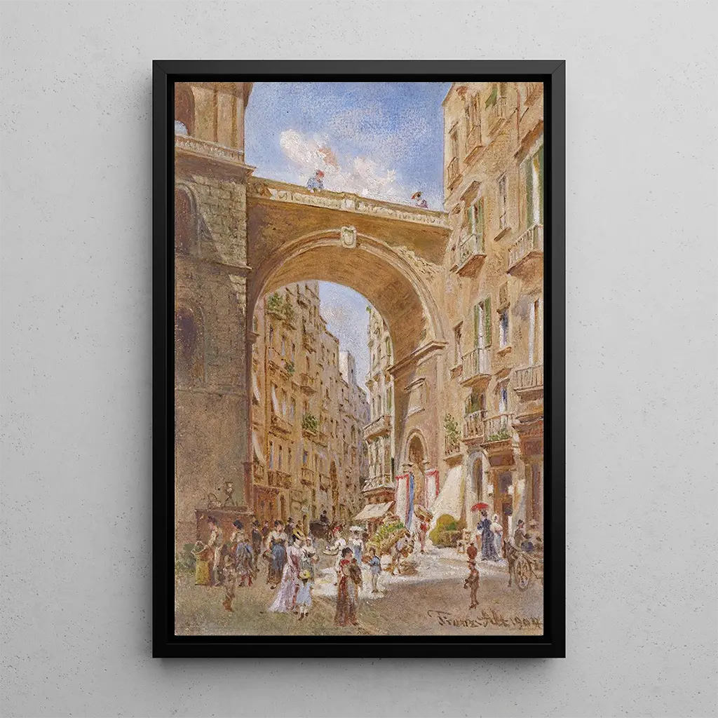 Det konsttryck "Naples Pont de Chiaia" av Franz Alt fångar den vibrerande essensen av napolitansk liv. Kompositionen framhäver en majestätisk bro, badad i ett gyllene ljus, medan livliga figurer rör sig över scenen. De varma färgerna och de delikata nyanserna i himlen skapar en atmosfär som är både glad och nostalgisk. Alt använder en oljemålningsteknik som ger liv åt de arkitektoniska detaljerna och texturen på förbipasserandes kläder, vilket inbjuder betraktaren att fördjupa sig i denna vardagsscen fylld av poesi.