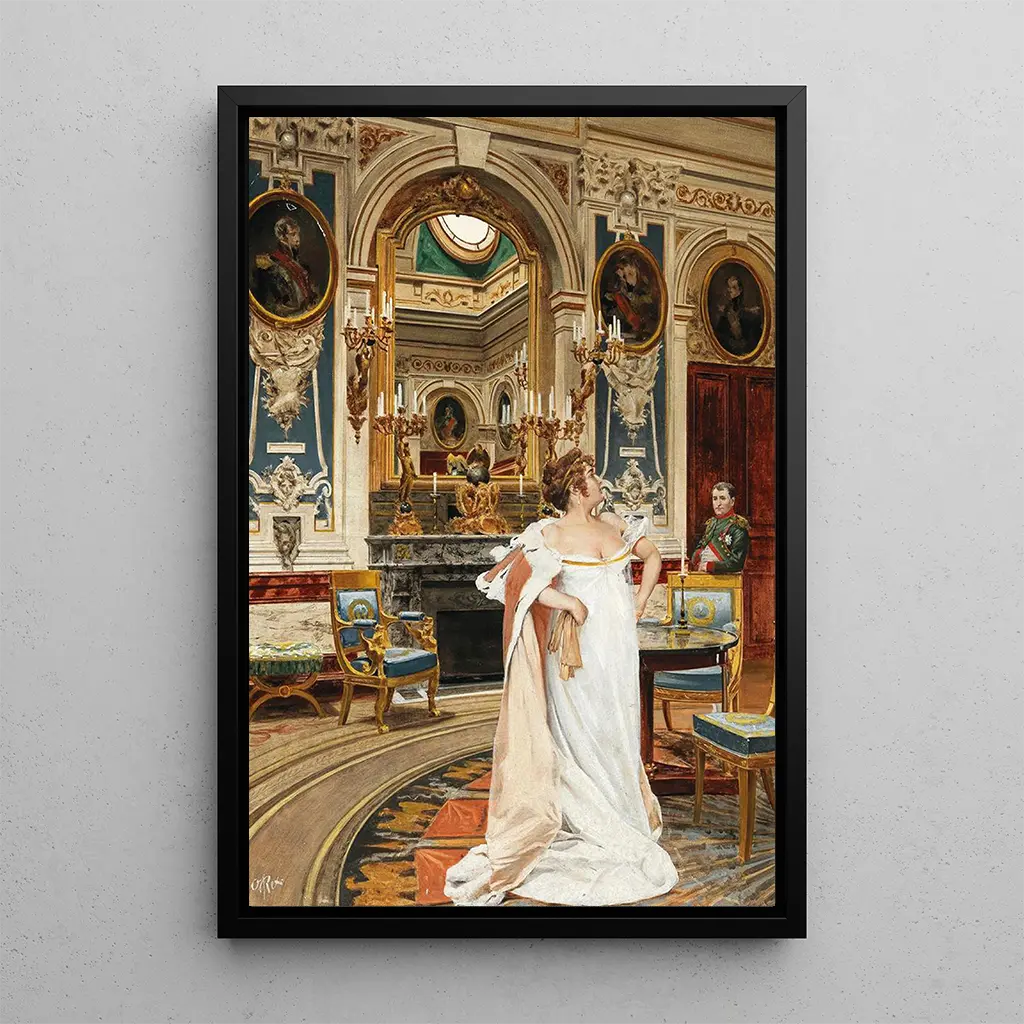 I detta fängslande konsttryck skildrar Oskar Rex Napoléon och Joséphine i ett ögonblick av intimitet, där de rika färgerna och de noggranna detaljerna framkallar en atmosfär av storhet och romantik. De gyllene nyanserna och blå tonerna skapar en slående kontrast, som betonar personernas majestät. Tekniken med oljemålning gör det möjligt att återge texturerna på kläder och ansikten med enastående precision, vilket fördjupar betraktarens förbindelse med det franska imperiets värld. Detta konsttryck, en sann hyllning till kärleken, inbjuder till reflektion över de komplexa känslor som förenar dessa två ikoniska historiska figurer.