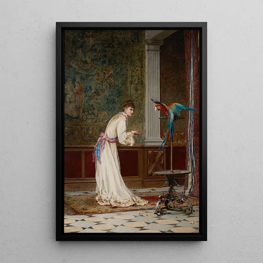 I detta fängslande konsttryck, "Nourring l'Ara", fördjupar sig Frederik Hendrik Kaemmerer i en levande och färgstark scen. Tavlan skildrar en varsamt klädd kvinna som erbjuder frön till en färgstark ara. Den strålande färgskalan hos fågeln kontrasterar med de mjuka nyanserna i den omgivande landskapet, vilket skapar en varm och välkomnande atmosfär. Kaemmerers teknik, som förenar realism och romantik, gör det möjligt att känna ömheten i detta ögonblick av delad närhet mellan människa och djur. Varje detalj, från araens fjädrar till kvinnans uttryck, är återgiven med en precision som inbjuder till eftertanke.