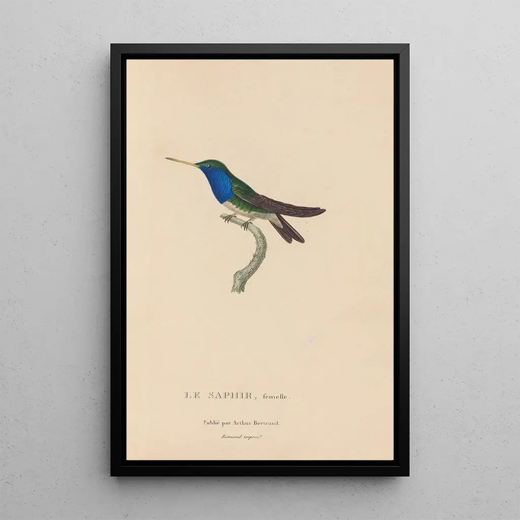 Den konsttryck Histoire naturelle des oiseaux-mouches Pl57 avslöjar en annan aspekt av fågelrikets prakt, med fokus på arter med fascinerande fjäderdräkter. Varje detalj är noggrant återgiven, från delikata nyanser till komplexa mönster, vilket skapar ett verk som fängslar ögat och sinnet. Färgpaletten, som sträcker sig från djupa blå nyanser till lysande gult, framkallar naturens rikedom. Tack vare en fin graveringsteknik lyckas René Primevère Lesson förmedla inte bara fåglarnas yttre skönhet, utan även deras levande essens, vilket inbjuder till en djupare reflektion över fågelfaunan.
