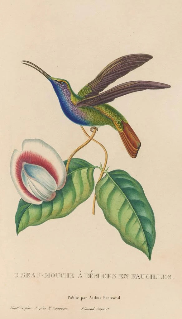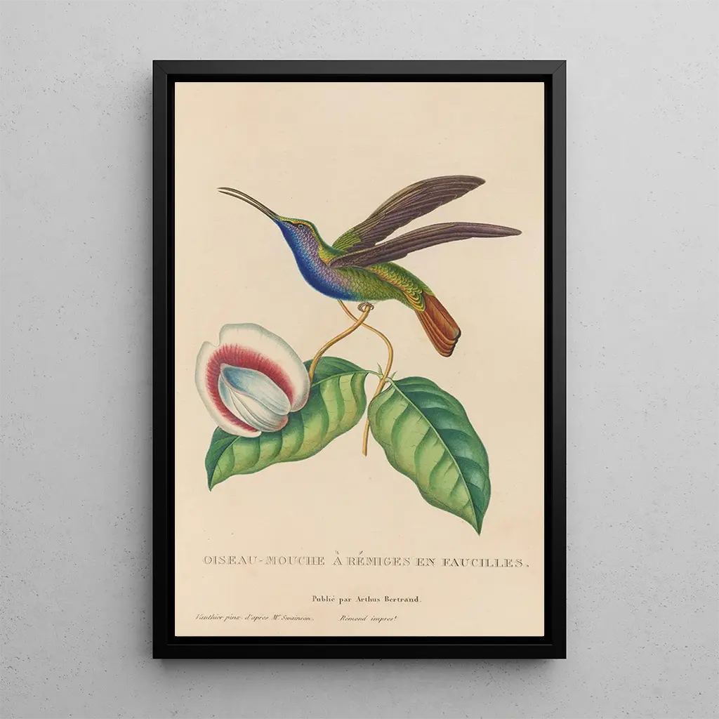 René Primevère Lesson, naturaliste et illustrateur du XIXe siècle, a su allier son amour pour la nature à son talent artistique. Ses œuvres, notamment celles consacrées aux oiseaux, témoignent d’une époque où la science et l’art se rejoignaient pour explorer la biodiversité. Influencé par les explorations de son temps, il a su capturer l’essence même des oiseaux-mouches, faisant de lui un artiste respecté dans le domaine de l’ornithologie. Ses konsttryck sont non seulement des œuvres d’art, mais aussi des documents précieux pour la compréhension des espèces aviaires.