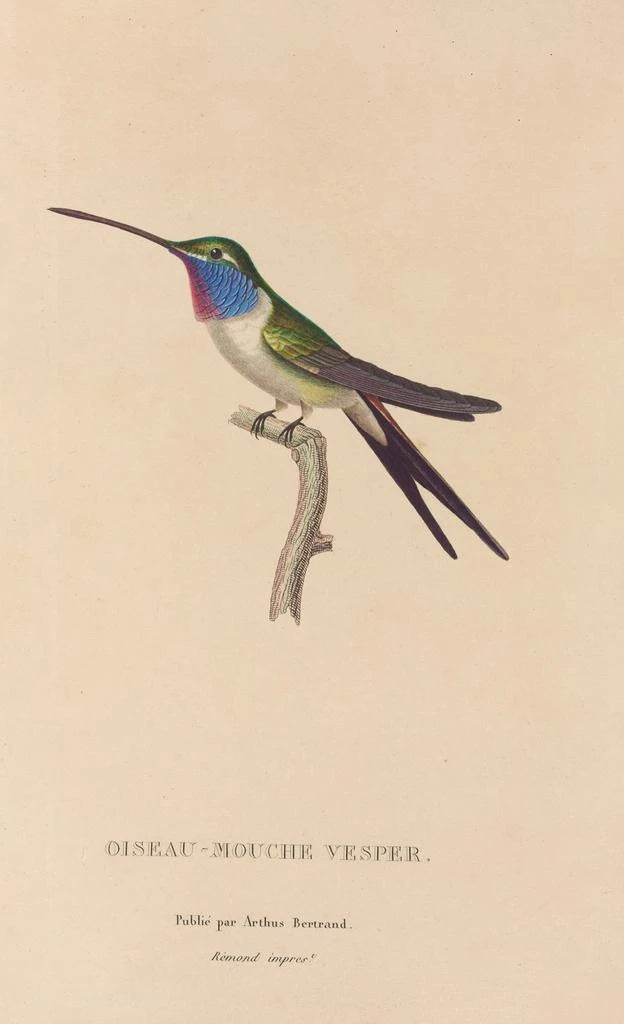 René Primevère Lesson, naturalist och illustratör från 1800-talet, spelade en avgörande roll i studiet och skildringen av fåglar. Hans arbete är en del av den vetenskapliga rörelsen från sin tid, där noggrann observation av naturen var avgörande. Påverkad av samtidens upptäckter lyckades han förena konst och vetenskap, vilket gjorde hans verk inte bara estetiskt tilltalande utan också informativa. "Histoire naturelle des oiseaux-mouches" är ett av Lessons många bidrag som vittnar om hans engagemang för bevarande och förståelse av fågelrikets biologiska mångfald.
