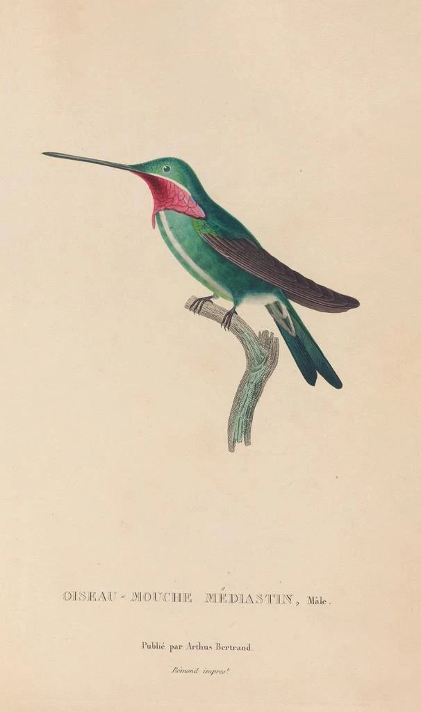 René Primevère Lesson, naturalist och ornitolog från 1800-talet, spelade en avgörande roll i dokumentationen av fågelarter. Hans arbete är en del av den vetenskapliga rörelsen på den tiden, där observation och klassificering av arter var av yttersta vikt. Påverkad av de botaniska och zoologiska utforskningarna av sin tid, lyckades Lesson förena vetenskap och konst, vilket gjorde hans verk inte bara informativa utan också estetiskt tilltalande. Hans arv består, eftersom hans illustrationer fortsätter att inspirera ornitologer och konstälskare, och vittnar om naturens betydelse i konsten.
