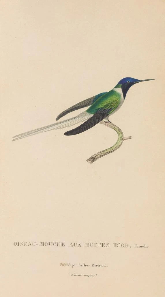 René Primevère Lesson, naturalist och illustratör från 1800-talet, spelade en avgörande roll i studiet av fåglar. Hans passion för naturen och hans skarpa observationsförmåga gjorde det möjligt för honom att skapa verk som förenar vetenskap och konst. Påverkad av upptäckterna från sin tid, lyckades han fånga själva essensen av de arter han avbildade, särskilt kolibrier, symboler för lätthet och skönhet. Hans illustrationer är inte bara konstverk, utan också värdefulla vetenskapliga dokument som vittnar om biodiversitetens rikedom. Lesson bidrog därmed till ornitologins framväxt, och förenade vetenskaplig noggrannhet med konstnärlig känslighet.