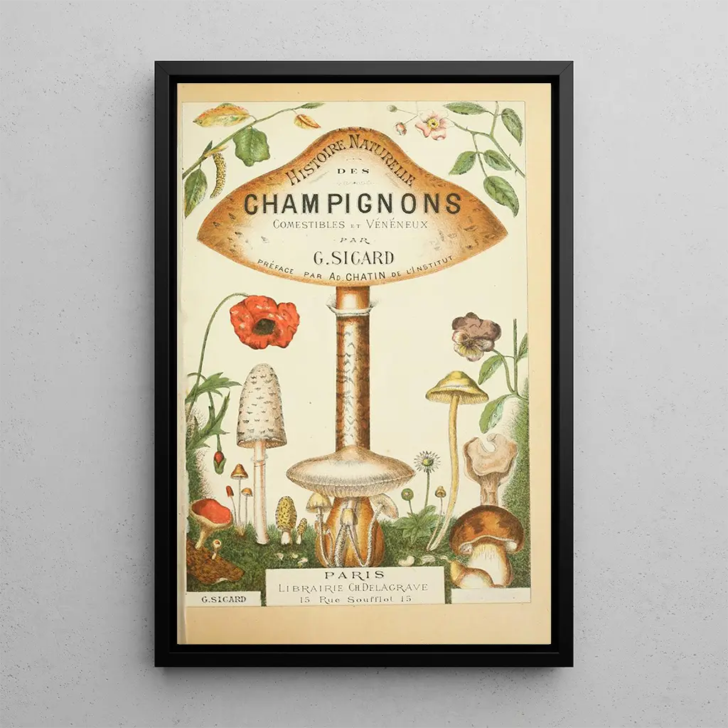 I denna konsttryck av "Histoire naturelle des champignons Pl01" bjuder Guillaume Sicard in oss att upptäcka rikedom och mångfald bland svampar genom en noggrann och detaljerad framställning. Verket, som förenar vetenskaplig precision med estetik, lyfter fram olika arter, var och en illustrerad med omsorg. De livfulla färgerna och de delikata texturerna hos svamparna skapar en levande och fängslande atmosfär. Sicard använder en akvarellteknik som möjliggör att fånga de subtila nyanserna i varje svamp, samtidigt som han behåller en naturalistisk ansats. Detta konsttryck är en sann hyllning till naturen och dess underverk.