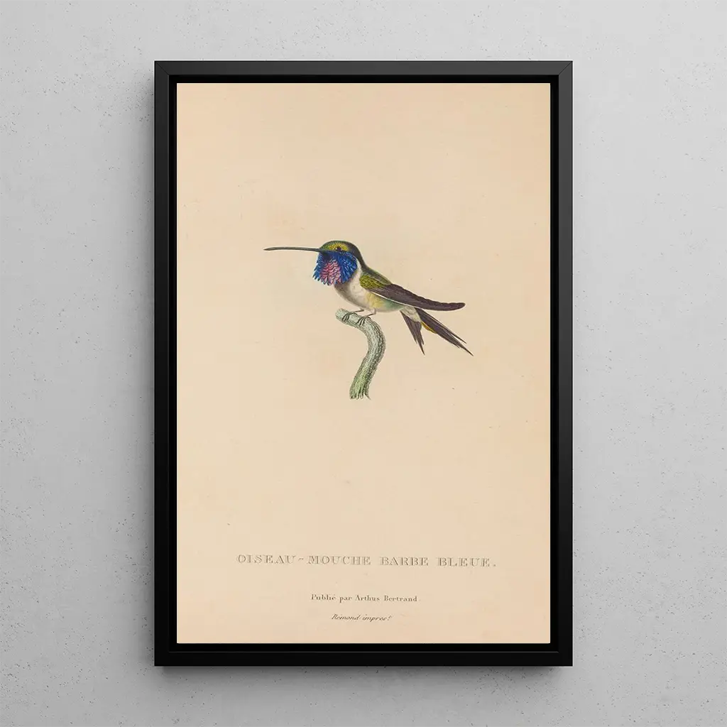 Den konsttryck Histoire naturelle des oiseaux-mouches Pl05 fördjupar oss i en färgstark och fascinerande värld. De livfulla nyanserna i fjädrarna, från djupa blå till lysande rött, återspeglar rikedomarna i fågelrikets biologiska mångfald. Varje fågel, noggrant återgiven, tycks komma till liv på duken tack vare den delikata akvarelltekniken som fångar ljuset och texturen i fjädrarna. Atmosfären som utstrålar från detta verk är både glad och kontemplativ, inbjudande betraktaren att uppskatta den flyktiga skönheten hos dessa vingarprydda varelser.