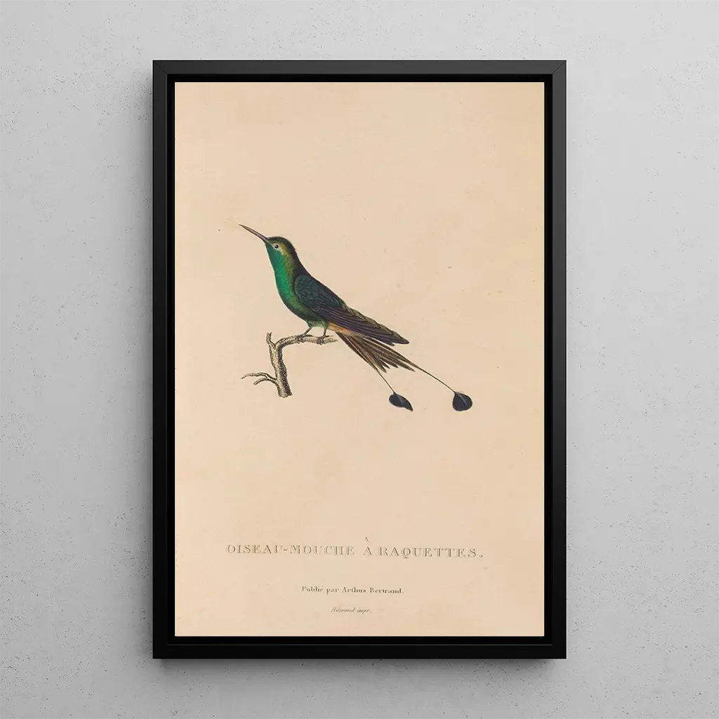 René Primevère Lesson, naturalist och illustratör från 1800-talet, präglade sin tid med sina bidrag till ornitologi och avbildningen av fågelarter. Påverkad av de vetenskapliga upptäckterna under sin tid, lyckades han kombinera vetenskaplig precision med konstnärlig känslighet. Hans verk, inklusive detta konsttryck Histoire naturelle des oiseaux-mouches Pl40, vittnar om hans engagemang för att dokumentera biologisk mångfald samtidigt som han hyllar fåglarnas estetiska skönhet. Lesson samarbetade med forskare och upptäcktsresande, vilket gav honom tillgång till sällsynta exemplar och berikade hans kunskaper, vilket gör honom till en oumbärlig figur inom naturalistisk illustration.