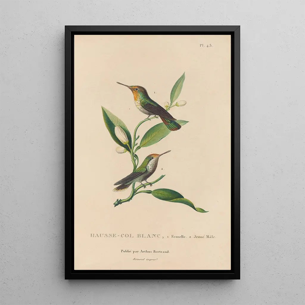 Den konsttryck av Histoire naturelle des oiseaux-mouches Pl43 fördjupar oss i en värld där den fågelrika mångfalden lyfts fram med en enastående precision. De livfulla färgerna och de noggranna detaljerna i fjädrarna avslöjar dessa vingade varelsers prakt, medan bakgrundens blomsterarrangemang berikar kompositionen med en frisk touch. Graveringstekniken som används av René Primevère Lesson gör det möjligt att fånga inte bara fåglarnas utseende, utan även deras essens, vilket skapar en levande och dynamisk atmosfär som inbjuder till förundran.