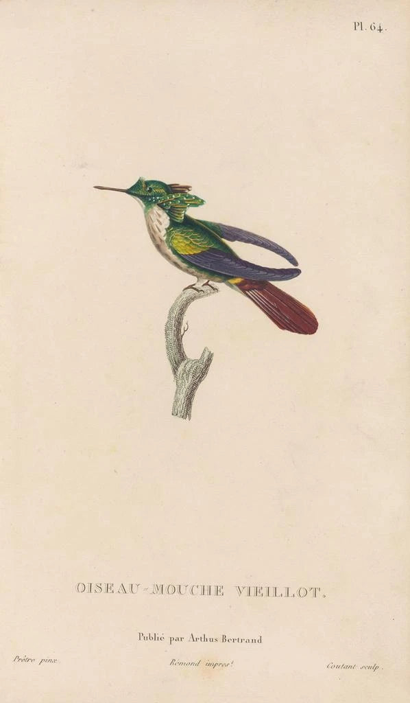 René Primevère Lesson, naturalist och illustratör från 1800-talet, lyckades förena vetenskap och konst med bravur. Aktiv under en period då utforskningen av arter var i full blom, påverkades han av samtidens upptäckter och den romantiska rörelsen som värdesatte naturen. Hans verk, särskilt i Histoire naturelle des oiseaux-mouches, vittnar om hans engagemang för att troget avbilda fågelfaunan. Som medlem av Vetenskapsakademien bidrog Lesson till att främja kunskapen om ornitologi, samtidigt som han lämnade ett varaktigt konstnärligt arv, vilket gör honom till en oumbärlig figur inom naturalistisk illustration.