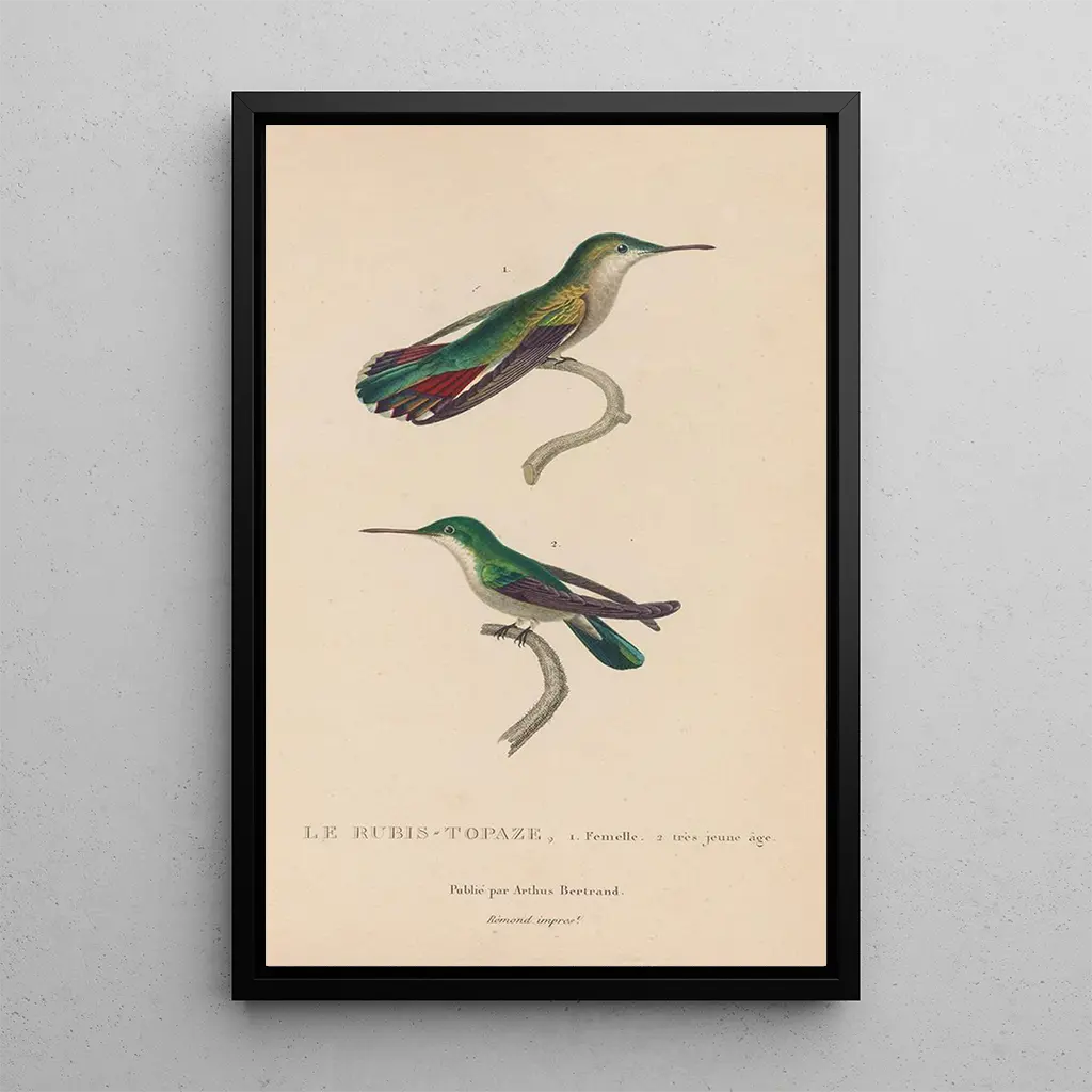 Den konsttryck Histoire naturelle des oiseaux-mouches Pl54 inbjuder till en förtrollande resa till naturens hjärta. Detta konsttryck, rikt på detaljer, framhäver delikata humlor, svävande i ett luftigt balett. De livfulla färgerna, från glänsande grönt till mjuka rosa, skapar en vibrerande och glad atmosfär. Konstnärens teknik, som blandar precision och flyt, gör det möjligt att känna lättheten hos dessa eteriska varelser. Varje fjäder är noggrant återgiven, och den övergripande kompositionen framkallar en perfekt harmoni mellan fåglarna och deras blomstrande omgivning.