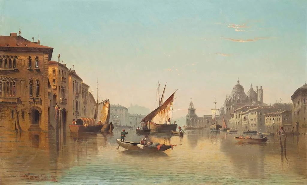 Dans cette œuvre captivante, Carl Kauffmann nous plonge au cœur de la magie vénitienne. Les navires, majestueusement amarrés le long du Grand Canal, semblent danser sous les reflets dorés du soleil couchant. Les couleurs vibrantes, allant des bleus profonds aux ocres chaleureux, créent une atmosphère à la fois paisible et dynamique. La technique de Kauffmann, mêlant réalisme et impressionnisme, donne vie à cette scène emblématique, où chaque détail, du mouvement des voiles à l'animation des gondoles, invite à une contemplation prolongée.