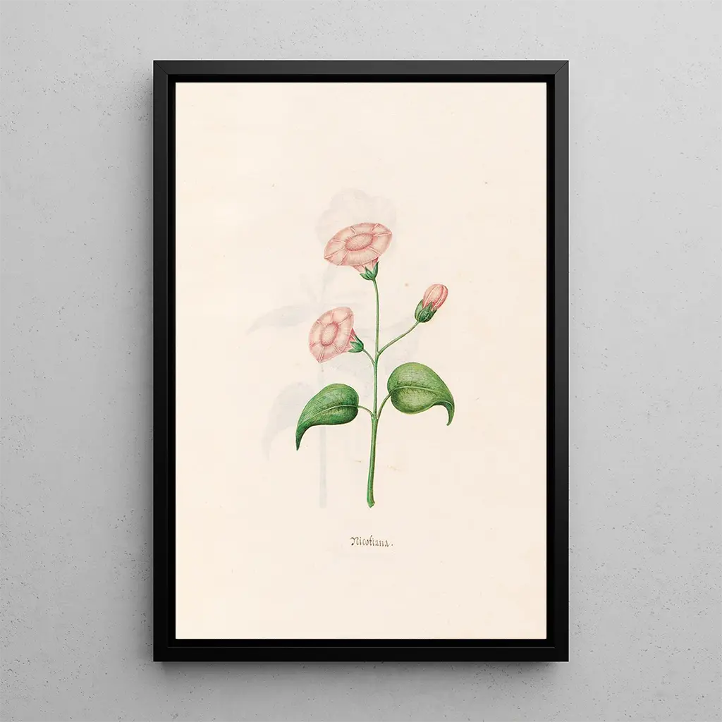 Nicotiana-konsttrycket av Magdalena Rosina Funck är ett livfullt verk som fångar naturens essens genom en palett av strålande färger. Skiftningarna av grönt, lila och rosa blandas harmoniskt och skapar en atmosfär som är både mild och dynamisk. Akvarelltekniken, använd med fin precision, ger liv åt de delikata tobaksblommorna, som symboliserar både den flyktiga skönheten och livets komplexitet. Varje blomblad tycks vibrera under ljuset och inbjuder betraktaren att fördjupa sig i en värld av lugn och eftertanke.