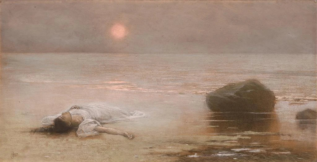 Dans l'œuvre "Noyé", Jakub Schikaneder capture une atmosphère poignante, où la nature et l'humanité se rencontrent dans un moment tragique. La composition, centrée sur le corps inanimé flottant dans l'eau, est accentuée par des couleurs sombres et des nuances de bleu qui évoquent la tristesse et la contemplation. La technique de Schikaneder, mêlant réalisme et impressionnisme, crée une profondeur émotionnelle, tandis que la lumière joue sur les reflets de l'eau, ajoutant une dimension presque onirique à la scène. Ce tableau invite le spectateur à réfléchir sur la fragilité de la vie et la beauté tragique de la mort.