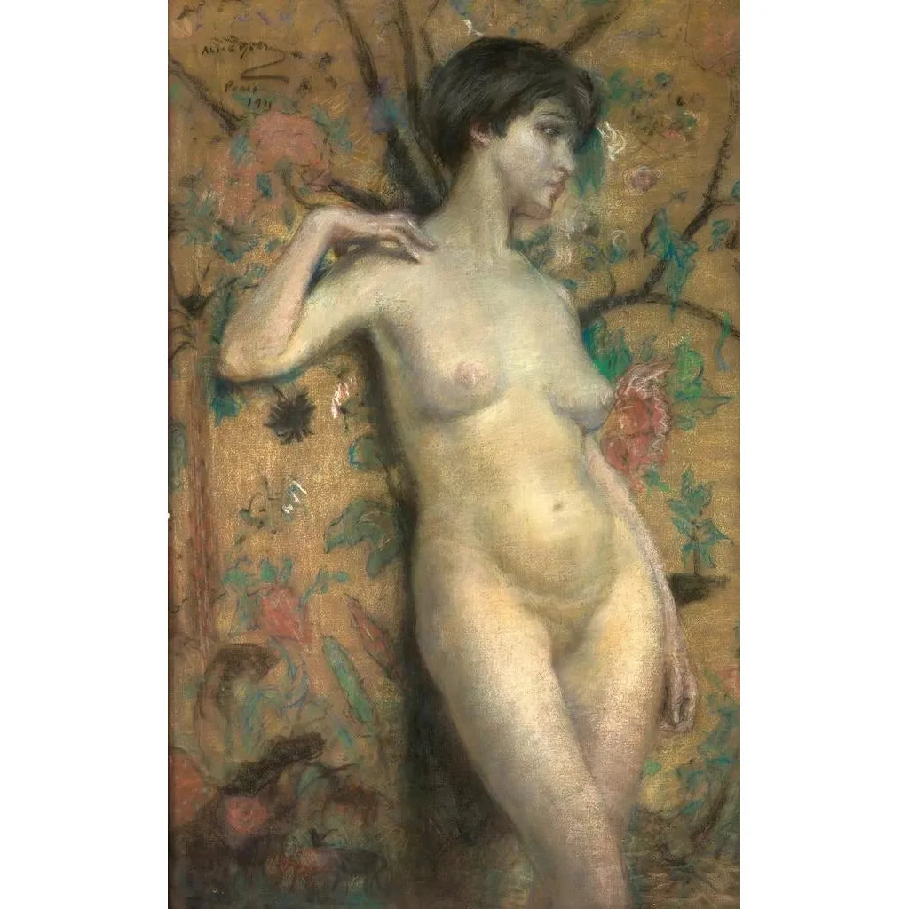 I konsttrycket Nu devant un paravent fördjupar Alice Pike Barney oss i en värld av ömhet och sensualitet. Kompositionen framhäver en kvinnlig figur, elegant poserad framför en rikligt dekorerad paravent, vilket skapar en slående kontrast mellan nakenhet och ornamentik. De mjuka färgerna och ljusspel betonar kroppens kurva, medan den texturerade bakgrunden framkallar en drömlik och mystisk atmosfär. Konstnärens teknik, som kombinerar realism och impressionism, gör det möjligt att känna värmen i scenen, som om man bevittnar ett stulen ögonblick av intimitet.