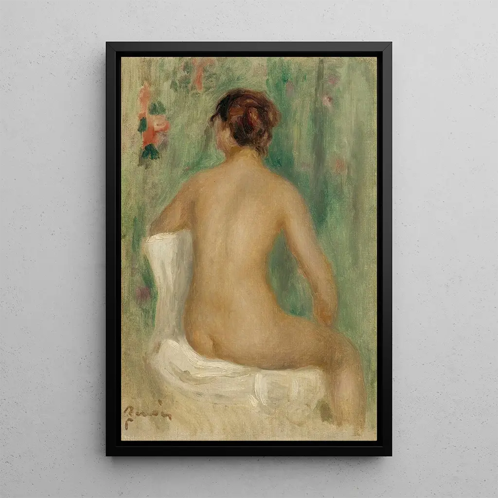 I detta fängslande konsttryck fördjupar sig Pierre-Auguste Renoir i intimiteten hos en sittande kvinna, vänd mot bakifrån. De delikata kurvorna av hennes kropp, badande i ett mjukt och varmt ljus, framkallar en atmosfär av frid och eftertanke. Färgpaletten, som blandar varma toner och pastellnyanser, skapar en harmonisk balans som drar till sig blickar. Renoirs impressionistiska teknik, med sina flytande penseldrag och förmåga att fånga ljuset, ger liv åt scenen och gör den nästan taktil, med en känsla av den omgivande luftens mjukhet. Detta konsttryck, en sann inbjudan till eftertanke, påminner oss om livets flyktiga skönhet.