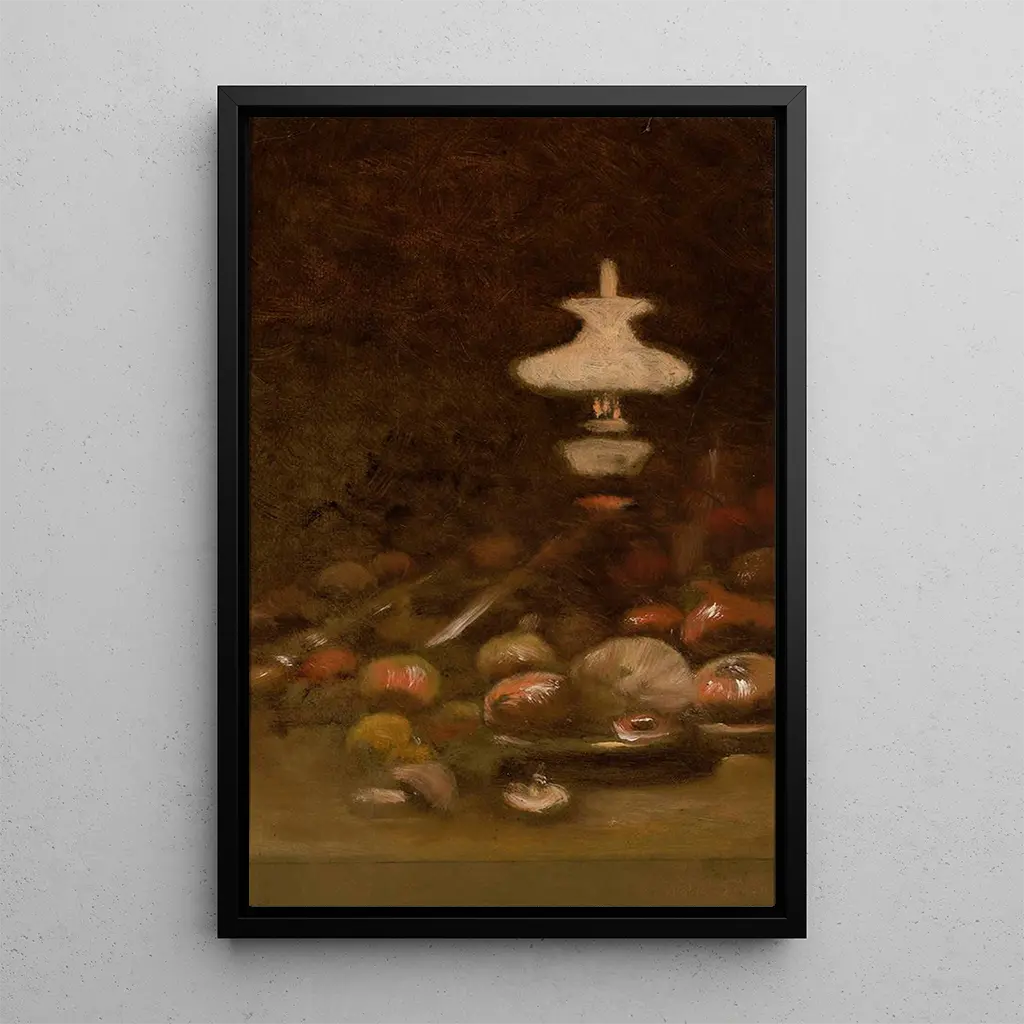 Konsttrycket av "Oljelampa och frukt" av Władysław Aleksander Małecki fördjupar oss i en intim scen där det mjuka ljuset från en oljelampa lyser upp noggrant arrangerade frukter. De varma färgerna, från gyllene gult till djupa rött, skapar en varm och välkomnande atmosfär. Małeckis teknik, kännetecknad av en slående realism, gör att man nästan kan känna texturen av frukterna och värmen från ljuset. Varje detalj är noggrant återgiven, vilket inbjuder betraktaren att närma sig och beundra denna harmoniska komposition.